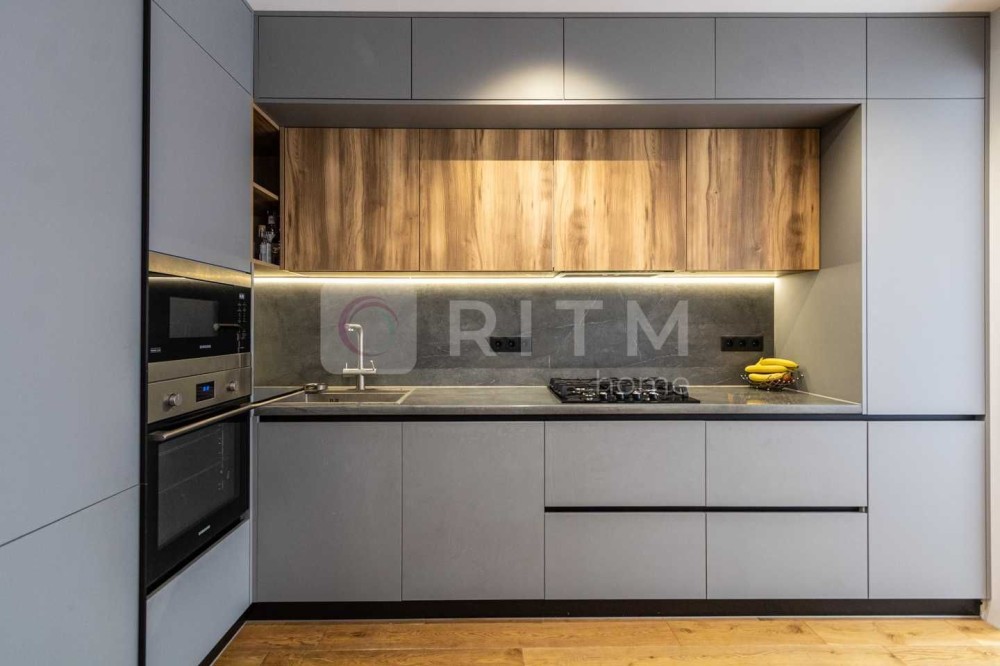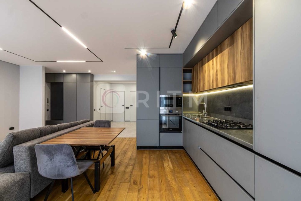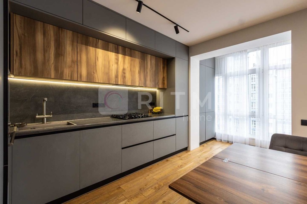 Простора кухня-студія об’єднує комфорт і стиль: дві лоджії, меблі з двостороннього МДФ, фурнітура Blum, техніка Samsung (включно з посудомийною машиною). Встановлено фільтр Ecosoft, мийку з омивачем склянок, висувний кран, підсвітку стелі, кондиціонер CH і розетки для телевізора та подрібнювача.