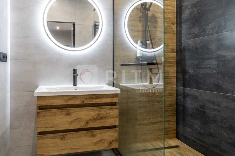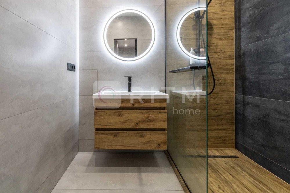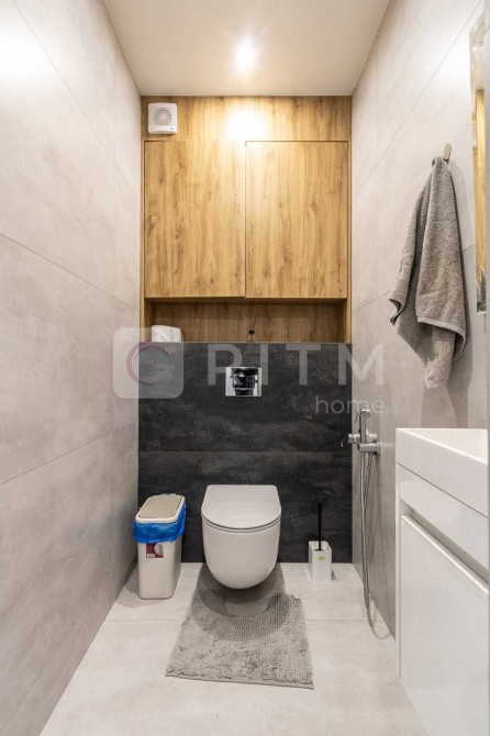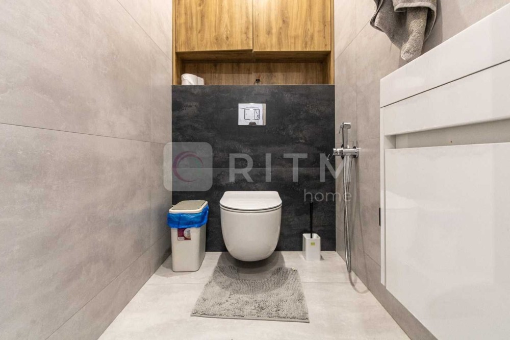 Роздільний санвузол виконаний у сучасному стилі — сантехніка преміум-класу, гігієнічний душ, рушникосушка чорного кольору, душова кабіна з чорними акцентами та загартованим склом. Є тепла підлога та вентиляційна система.