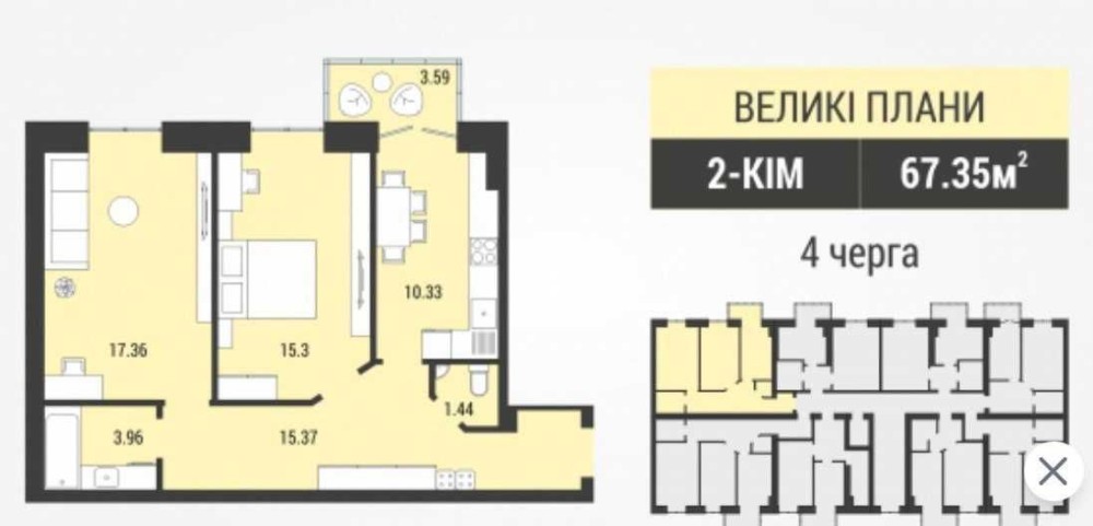 Площа 67 м2,кухня 12м2, вітальня 17,3м2, спальня 15,3 м2, ванна 4м2, санвузол 2м2.