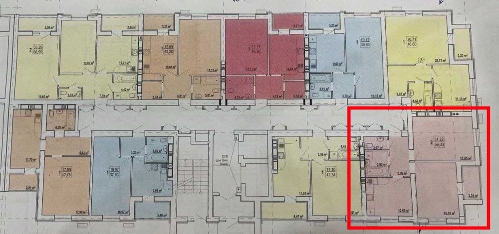 Общая площадь квартиры – 57 кв.м, 2е раздельные комнаты – 14.3 кв м с выходом на балкон и 17.1 кв м, просторная кухня – 11 кв м, санузел раздельный, высота потолка 2.7м.