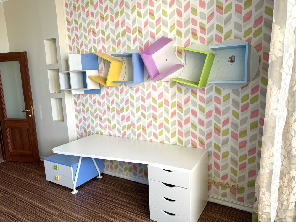 - друга кімната облаштована наразі під дитячу - має ліжечко, меблі для зберігання одягу та іграшок, письмовий стіл і засклений великий балкон