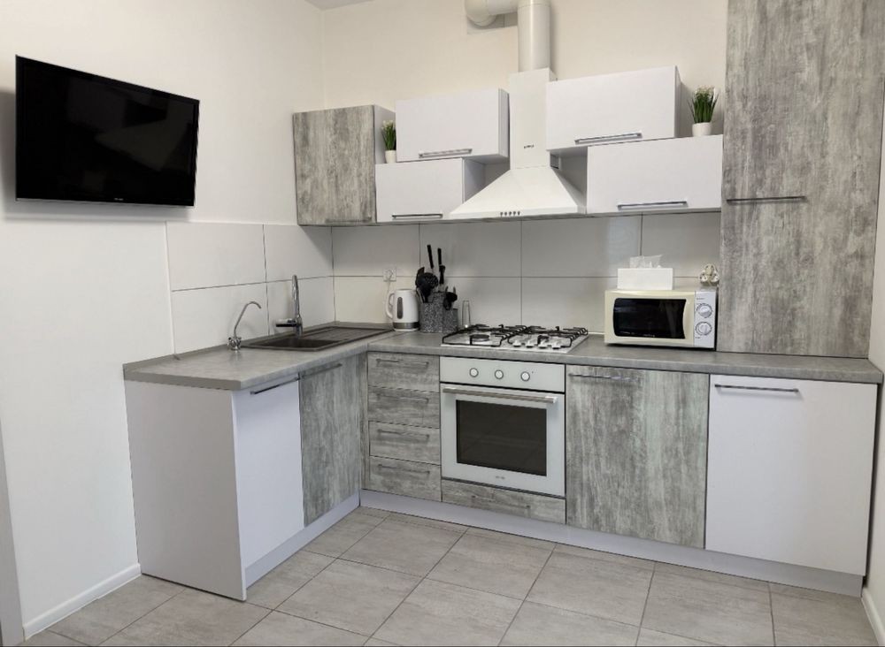2 телевізори, пральна машина, кондиціонер, електрична духовка, газова плита, мікрохвильовка, холодильник, витяжка, фільтр для води, чайник.