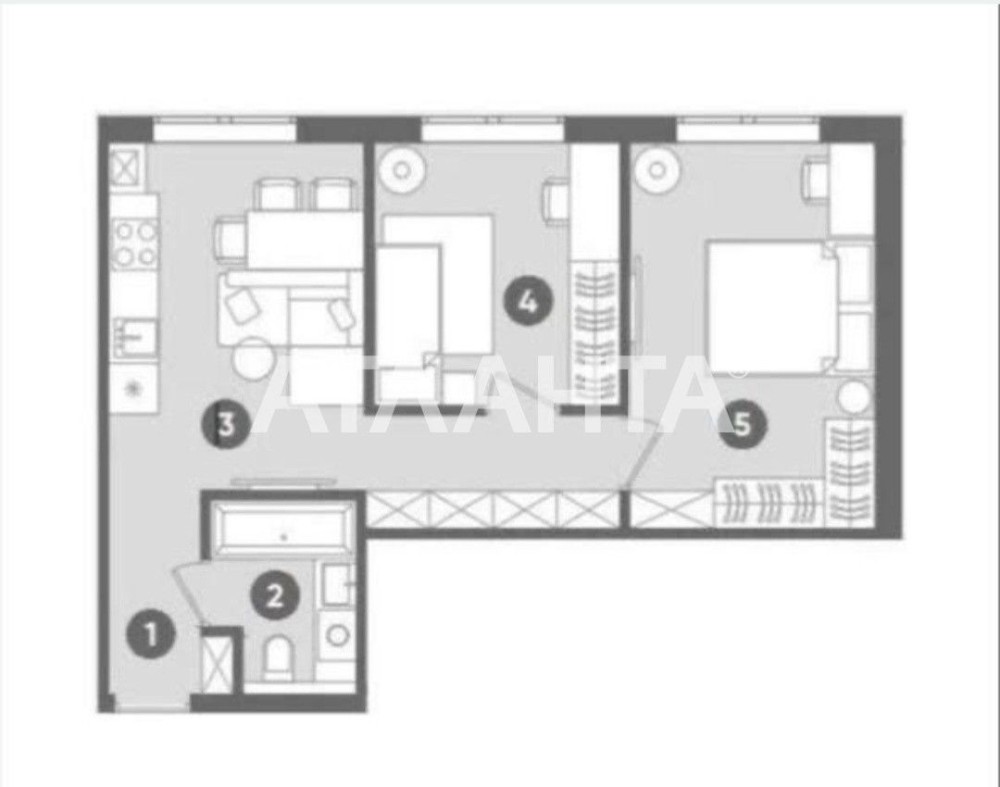 Квартира має зручне планування: кухня-студія та дві окремі кімнати, які можна оформити як спальну, та дитячу або кабінет.
