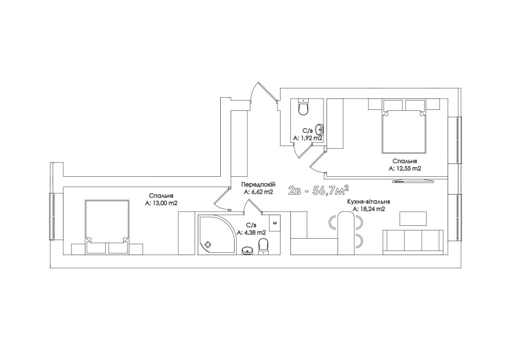 • Загальна площа 57 м2