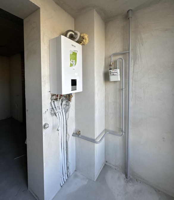 лазерна стяжка підлоги, цементно-піщана штукатурка всіх стін, розведення електрики по всій квартирі + інтернет / телебачення / домофон, стеля - моноліт, а не пустотілі плити, двоконтурний турбований газовий котел, радіатори з розведенням по квартирі, металопластикові вікна (3 скла), вхідні металеві двері з накладкою МДФ, лічильники - газ, електрика, вода.