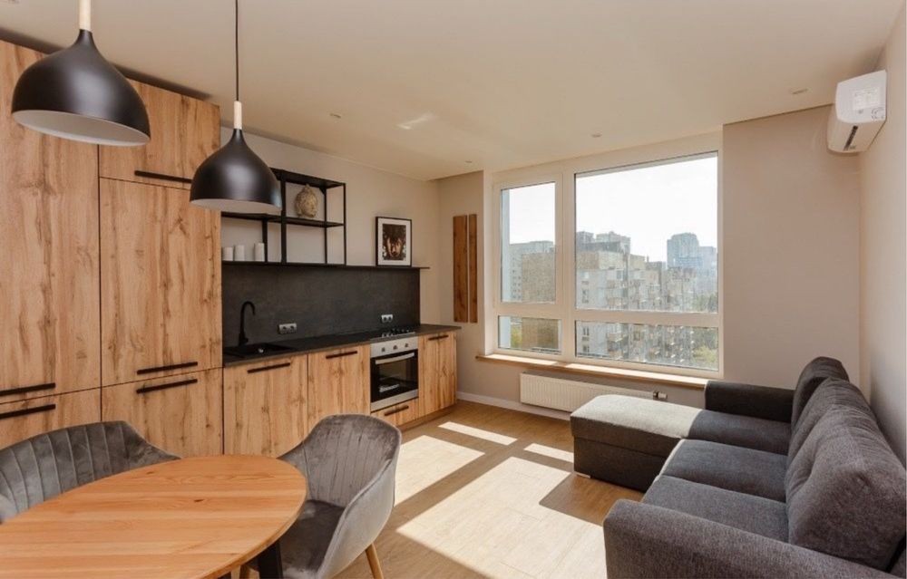ЖК Тайм, перший будинок, вхід з фасаду Липківського. Простора односпальна квартира. Велика кухня-вітальня. Квартира повністю мебльована і має всю необхідну техніку. Кондиціонери. Зручний балкон, з можливістю влаштувати там робоче місце.