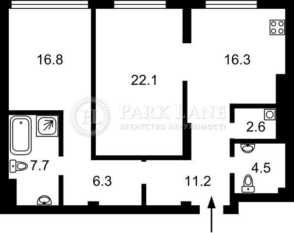 2 кімнати, 2 сан. вузла, пральня, кухня. Площа 91 м2. поверх 19/26
