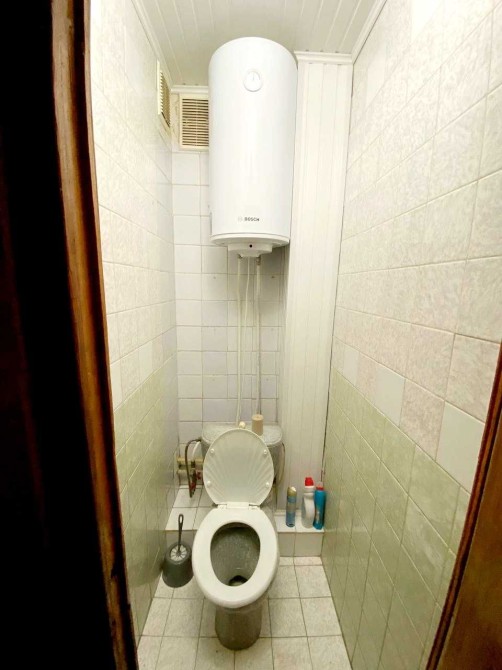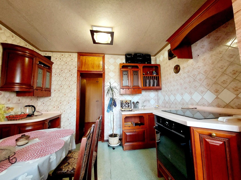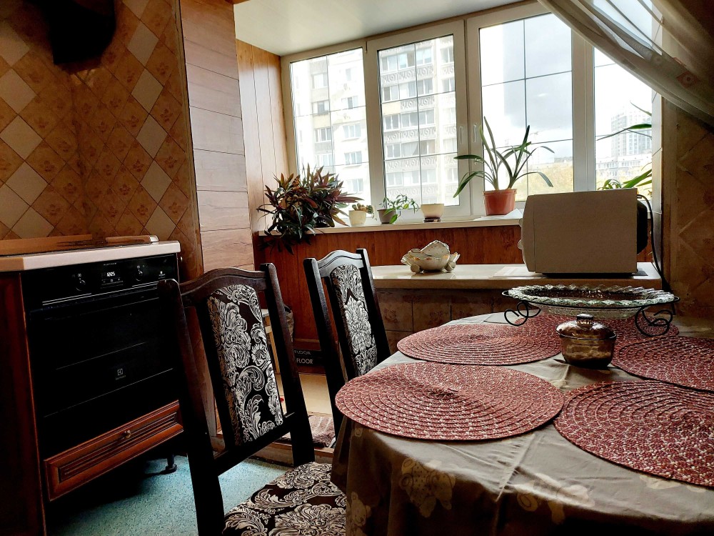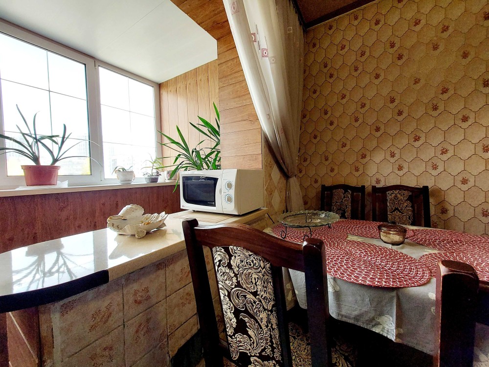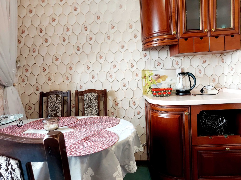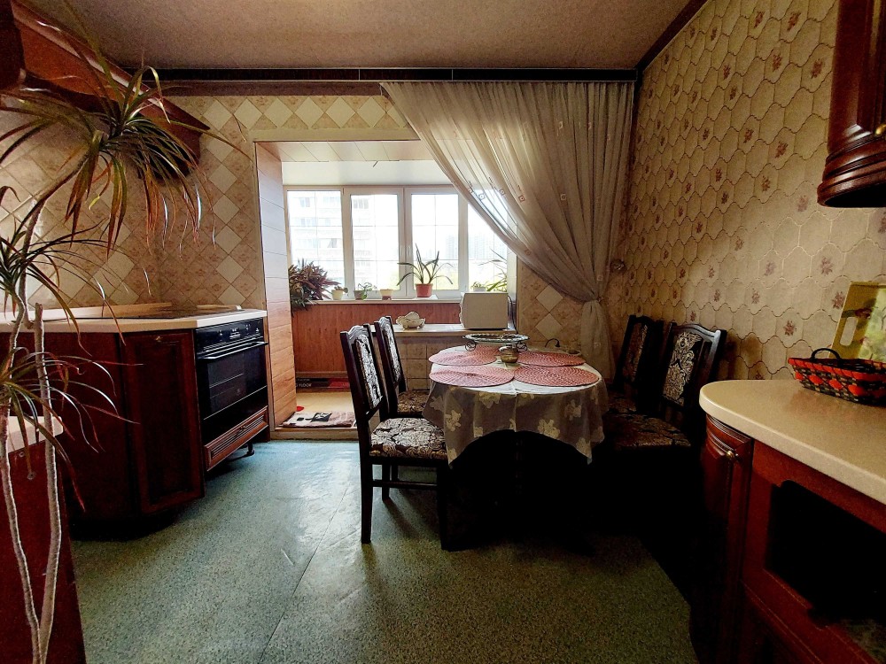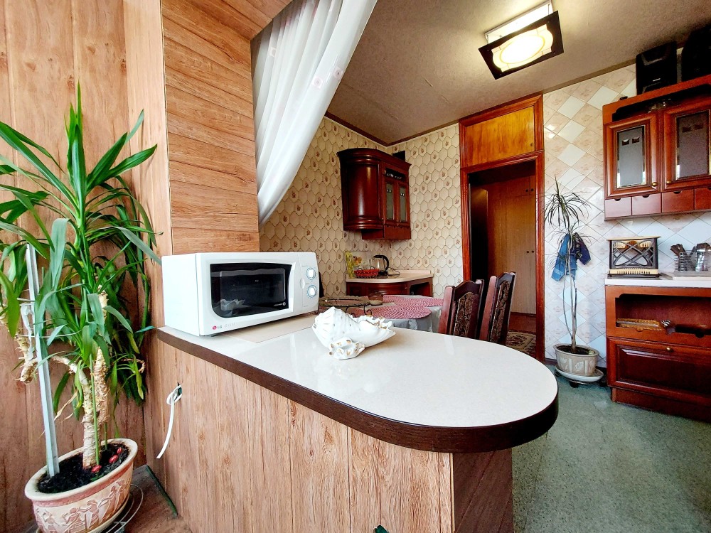 Кухня увеличена ,соединена с большой застекленной лоджией.Кухонная мебель - натуральное дерево(Италия).Установлен новый унитаз,бойлер на 60 литров.