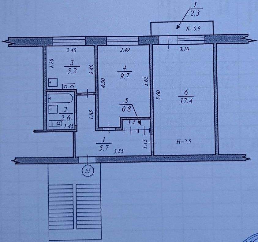 Квартира площею 42,3 м2, кухня 5,2 м2 на 4 поверсі 5 поверхового будинку.