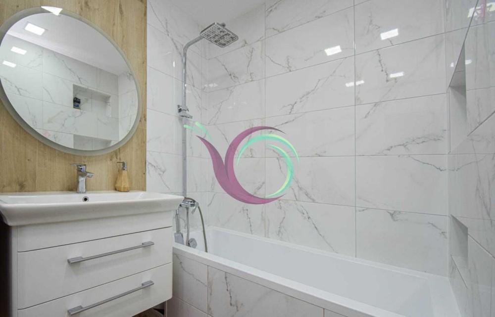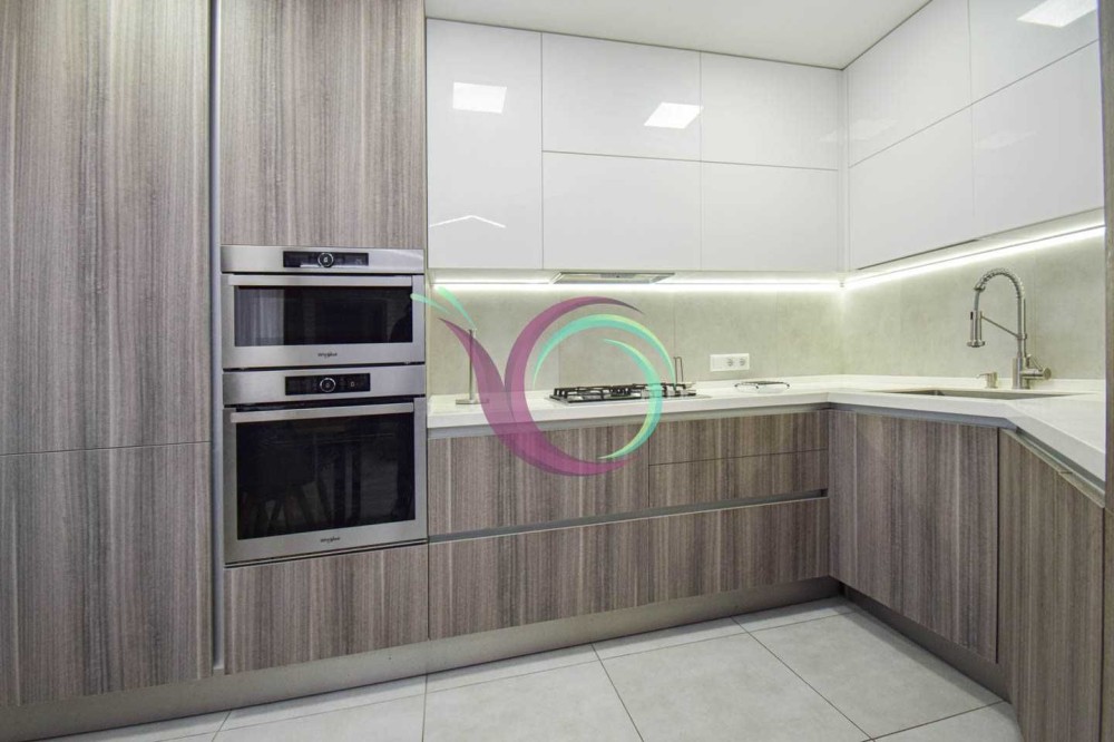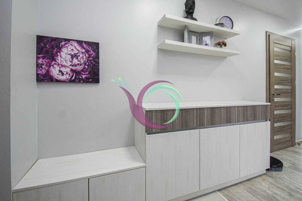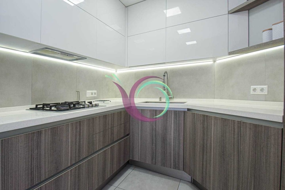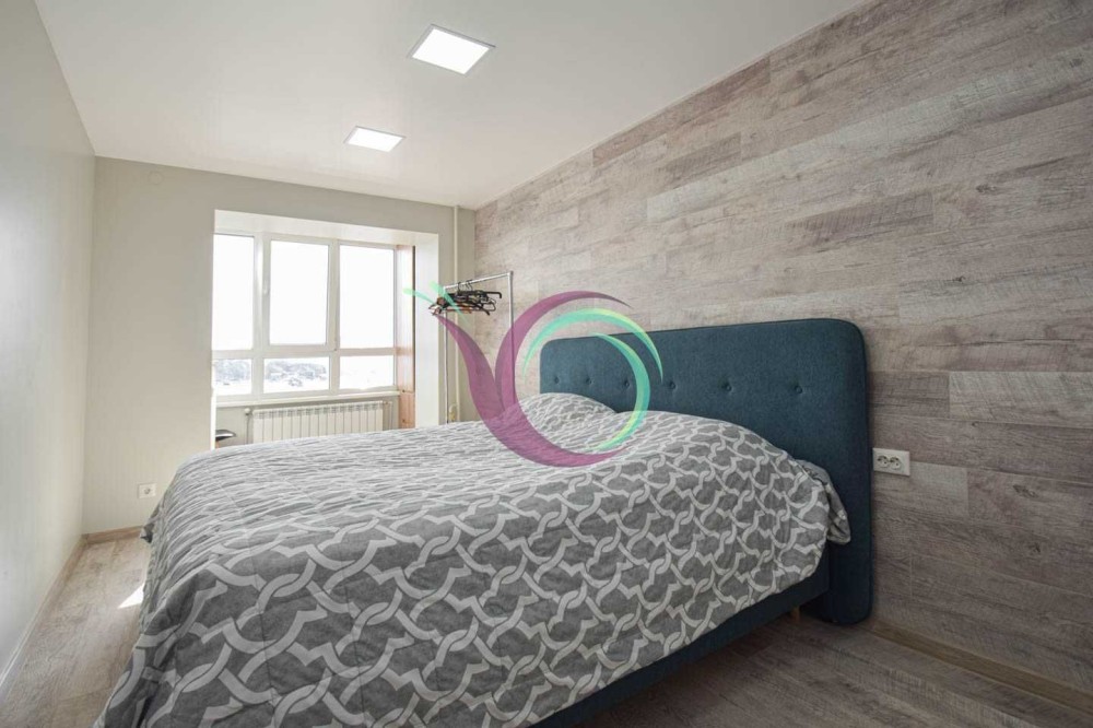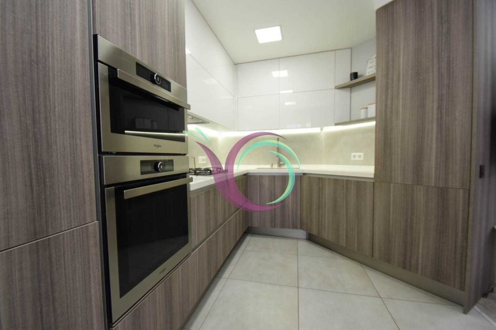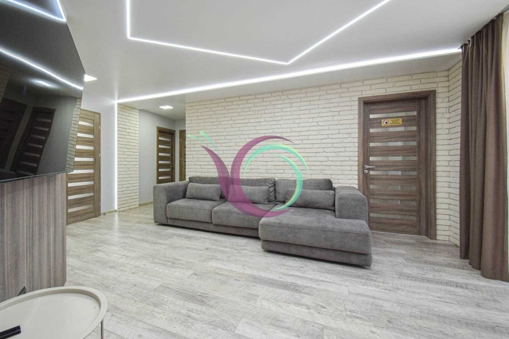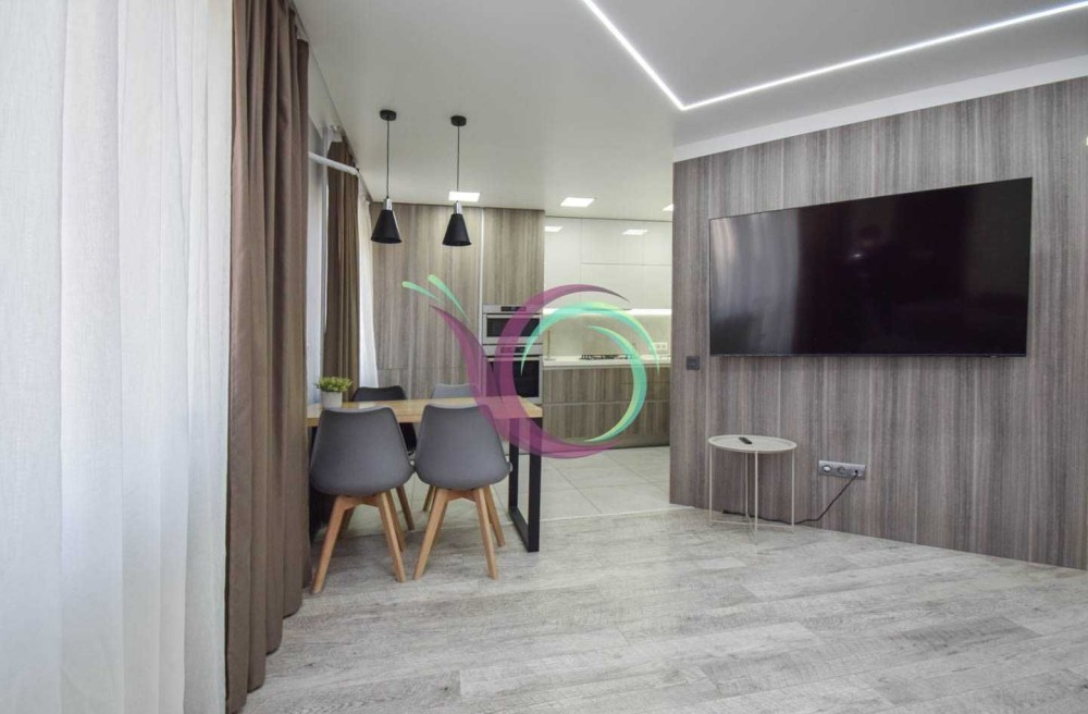 Світла квартира має 3 окремі мебльовані кімнати зі зручними ліжками та відокремленими комп’ютерними столами для дистанційного навчання. Кухня-вітальня умовно розділена на зону готування їжі площею 11 м2 обладнану шафами для посуду та всією необхідною побутовою технікою (мікрохвильова, духовка,