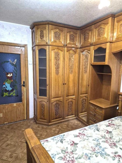 В спальній кімнаті залишаються дерев'яні меблі, встановлені склопакети та кондиціонер.