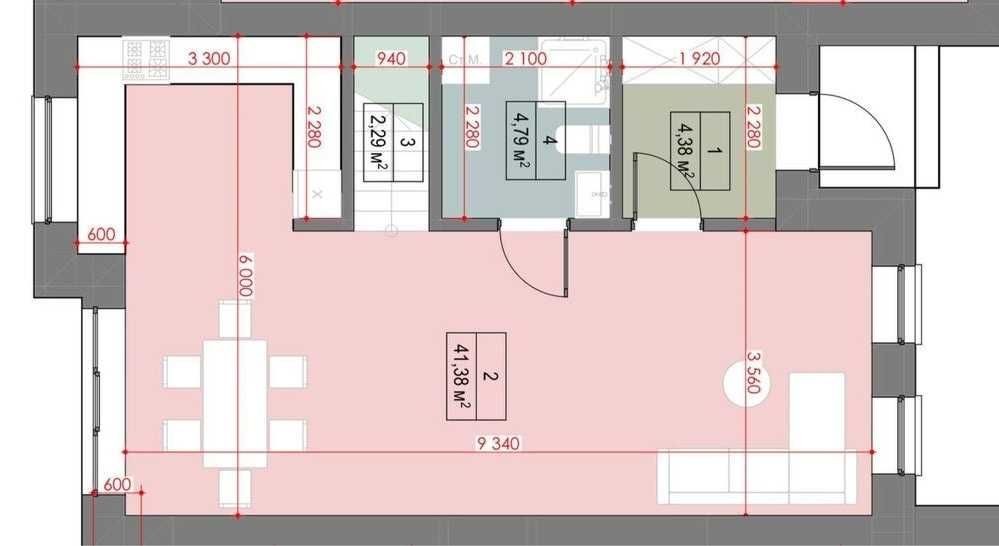 1 поверх — простора кухня-вітальня 43,3 м², санвузол, тамбур.