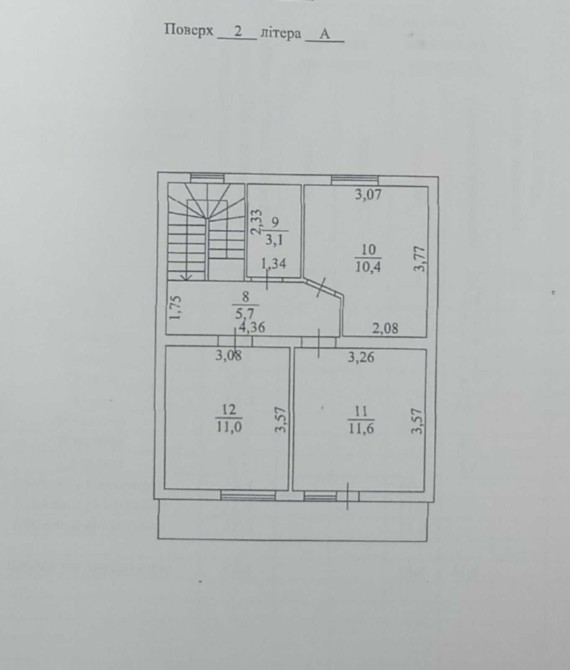 2-й поверх: коридор, санвузол, 3 кімнати.
