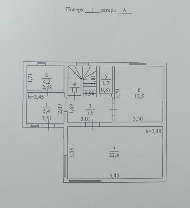 1-й поверх: 2 коридори, ванна, комора, туалет, кухня, вітальня.