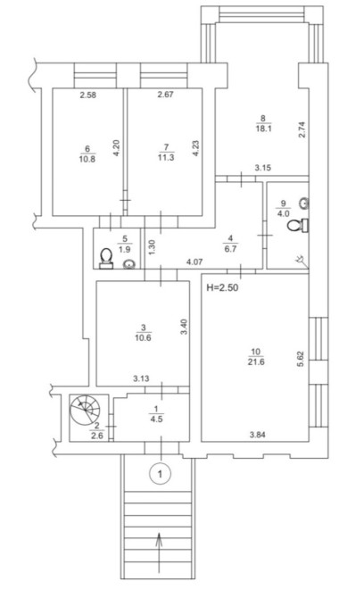Вхід в цоколь по гвинтовим сходам з предбанніку цього приміщення на першому поверсі.