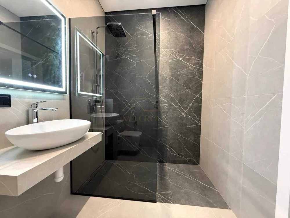 Використані якісні матеріали: керамограніт великого формату, вологостійкі оздоблювальні матеріали, сучасні текстури дерева та каменю