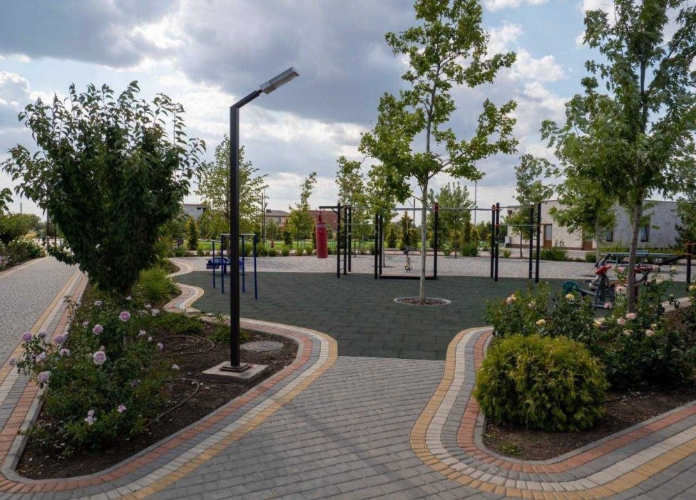 3. Озеленение поселка, оборудованная детская площадка для игр, современная школа, детский сад, собственный закрытый парк с ландшафтным дизайном и фонтанами для прогулок.