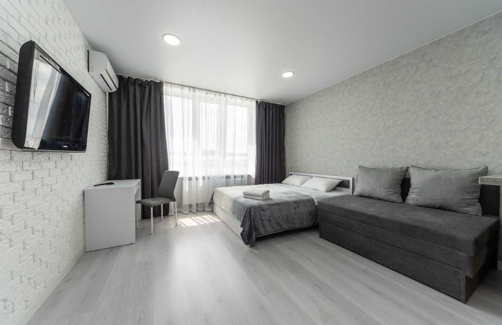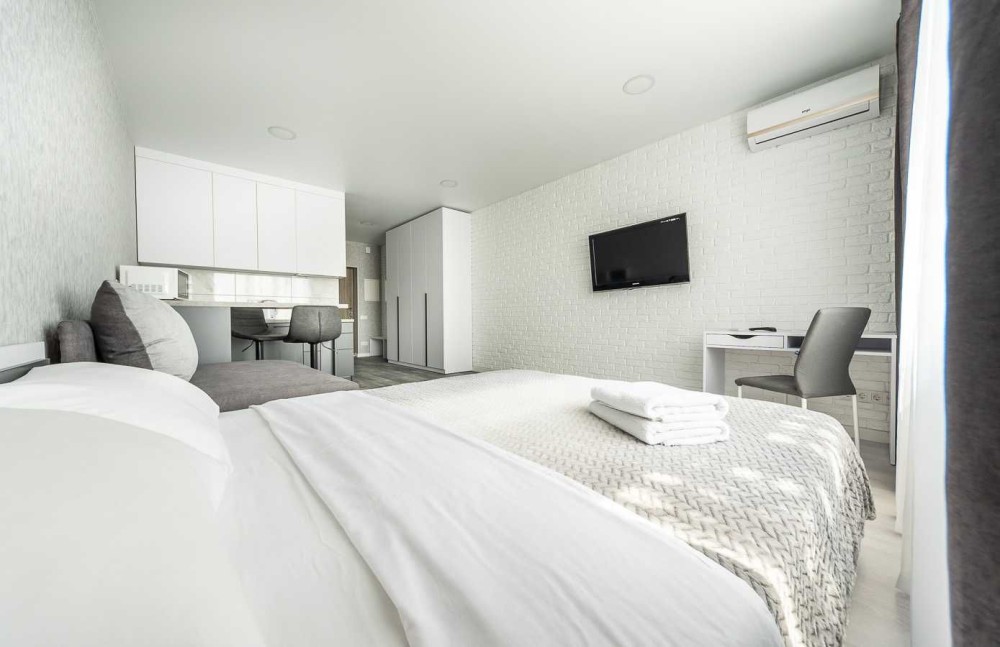 двоспальне ліжко, розкладний диван, письмовий стіл, кухня з обідньою зоною та посудом