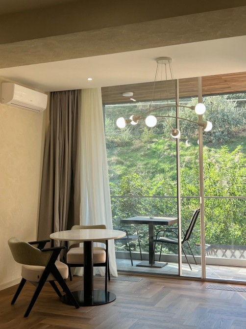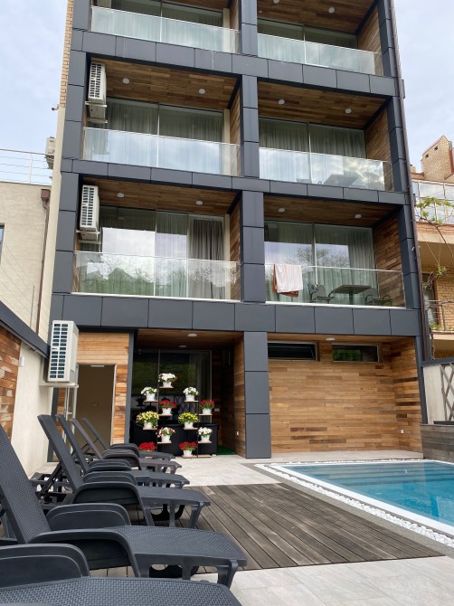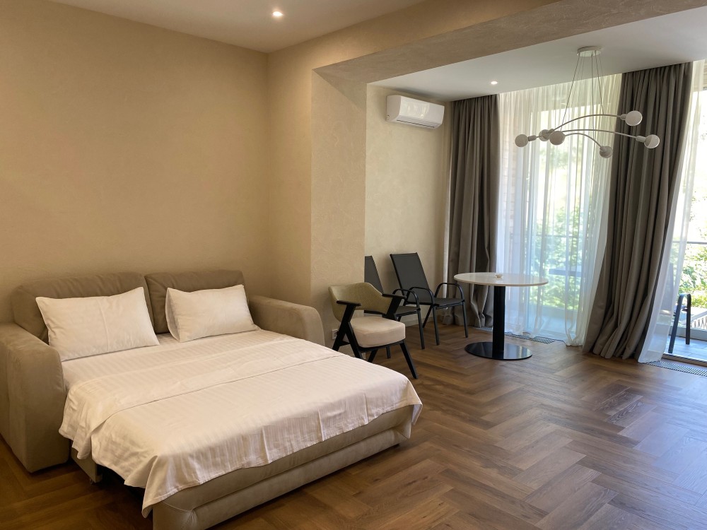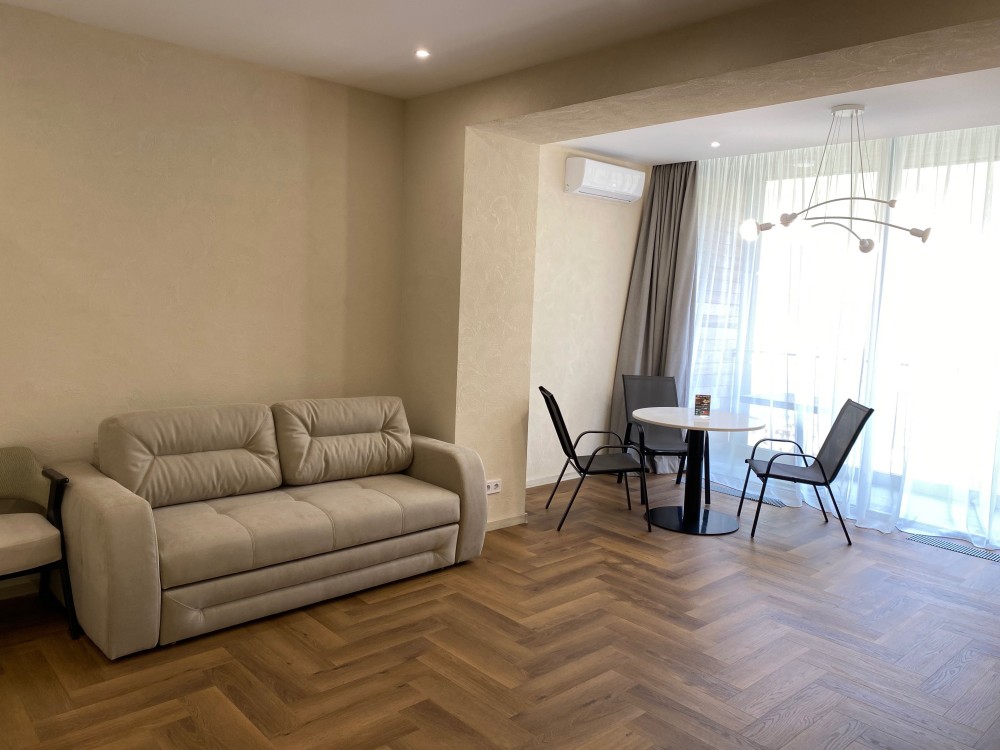 Апартаменты расположены на трассе здоровья, 13-я станция Фонтана в 4-х этажном коттедже на 2-м этаже. • Расстояние до моря — 30 метров, доступ к побережью по удобной пешеходной дорожке.В пятидесяти метрах на одном из пляжей расположен ресторан Кораблик с лаунж зоной и детской площадкой где очень комфортно можно провести весь день.В пяти минутах ходьбы находиться популярный ресторан Рыба где вы можете насладиться изысканной морской кухней. Двухкомнатные апартаменты с видом на бассейн.