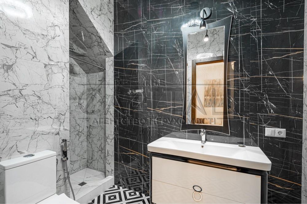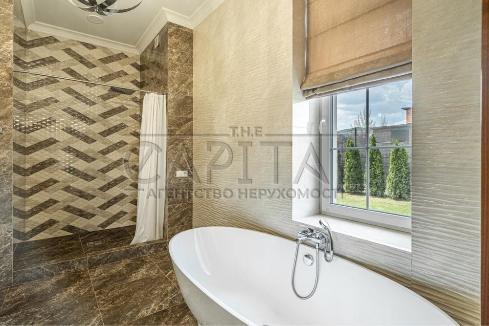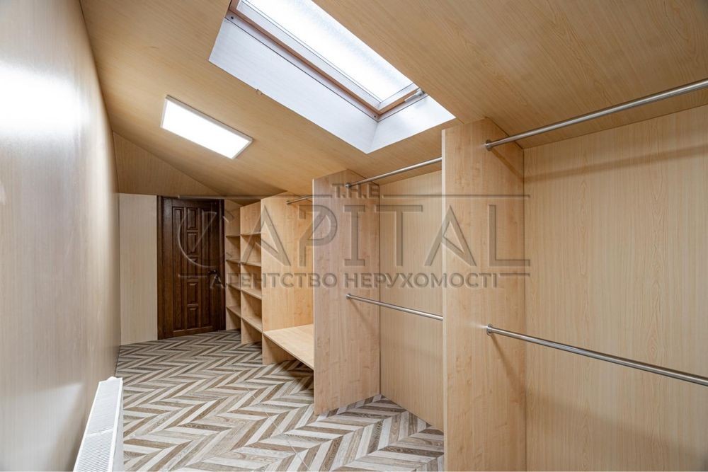 Другий поверх: простора спальня з виходом на балкон, с/в, вбиральня, ще одна спальна кімната. В обробці використані натуральні матеріали – мармур, дерево.