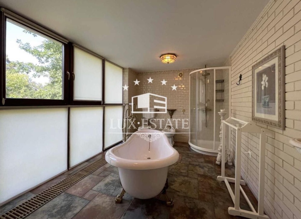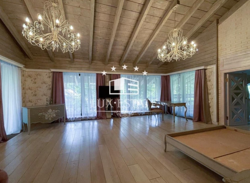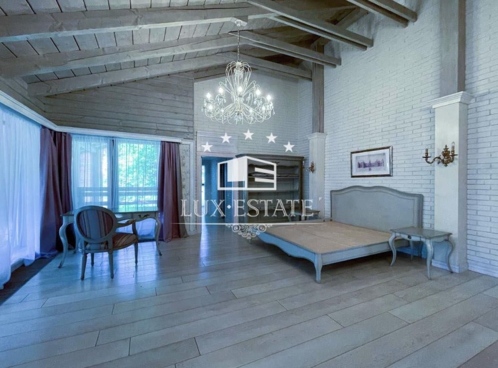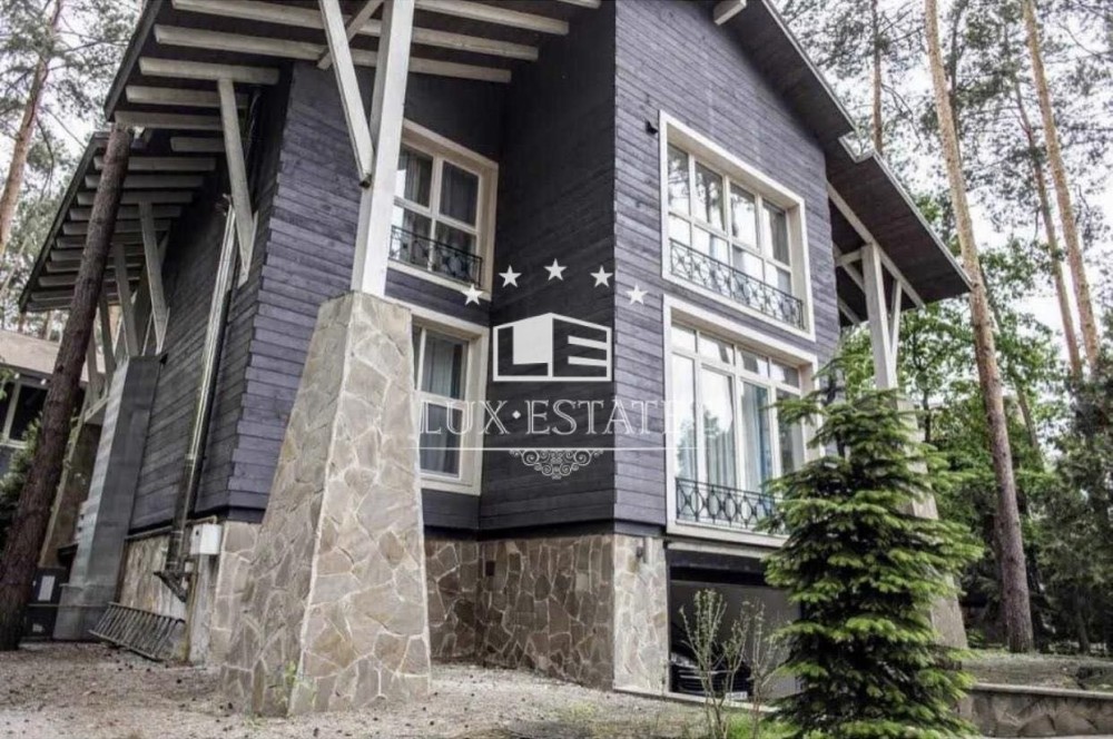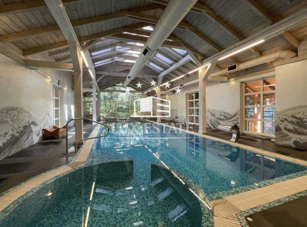 На территории сосновый лес, декоративное озеро, альтанка, СПА зона — бассейн с подогревом, сауна, хамам, спортзал. Дом в 3 этажа, общей площадью 360 м2, участок 15 соток.