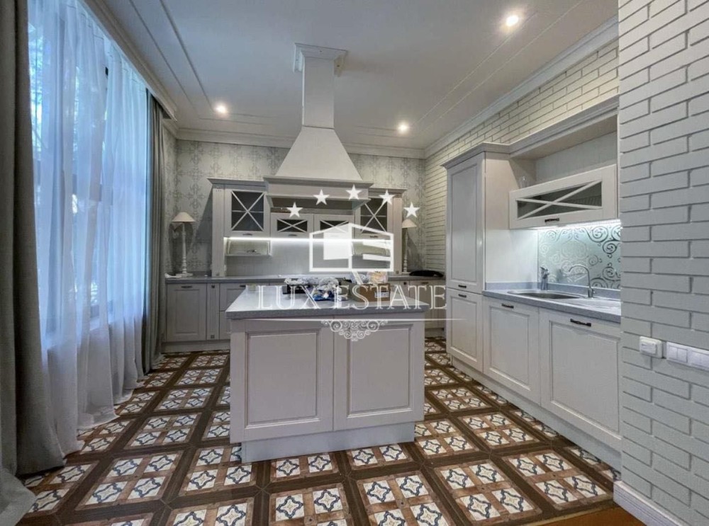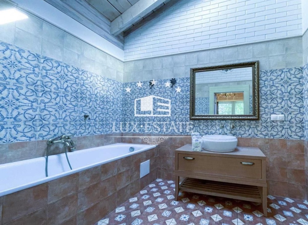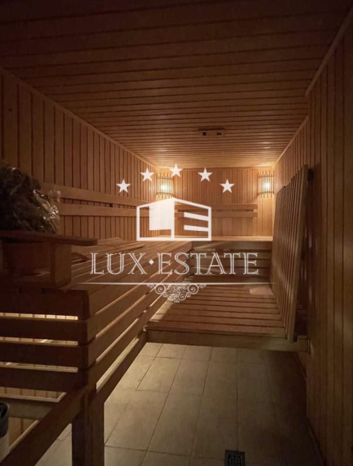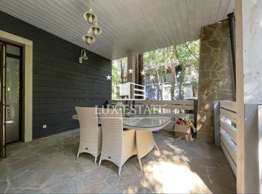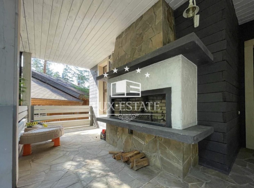 На территории сосновый лес, декоративное озеро, альтанка, СПА зона — бассейн с подогревом, сауна, хамам, спортзал. Дом в 3 этажа, общей площадью 360 м2, участок 15 соток.
