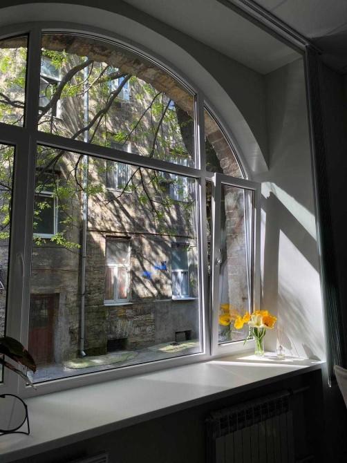 - Большое арочное окно с видом в тихий внутренний двор
