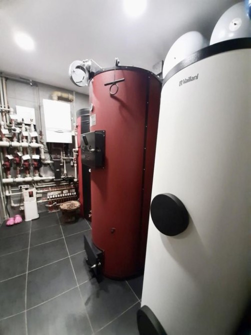 В доме две системы отопления (газовый и твердотопливный котлы) солнечные батареи.