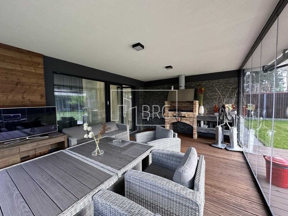 На территории: Ландшафтный дизайн,крытая терраса с зоной барбекю, освещение, парковка под навесом на 2 авто