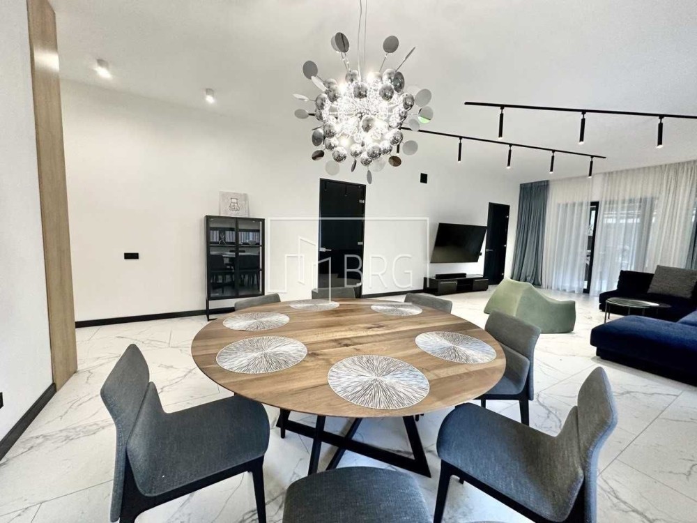 Описание: Гостиная с зоной столовой на 8 персон, кухня, мастер спальня с гардеробной и с/у, детская спальня с с/у, спальня, кабинет, постирочная, кладовая, гостевой с/у