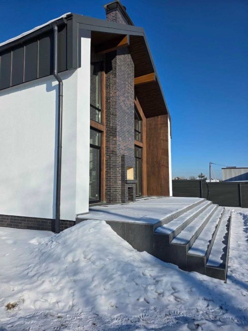 Будинок збудовано з якісних матеріалів: моноліт, газоблок AEROC, утеплення мінеральною ватою, вікна Rehau Solar, фасад із клінкером.