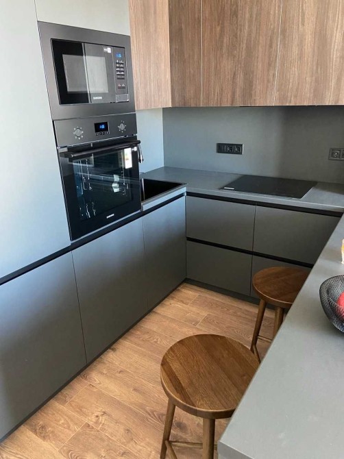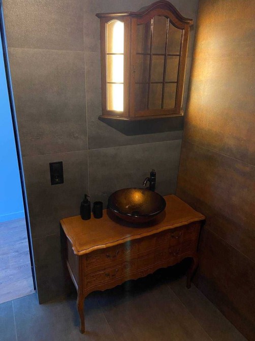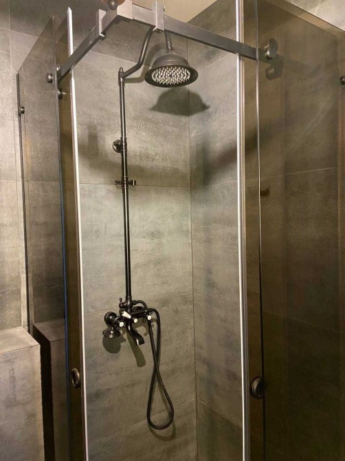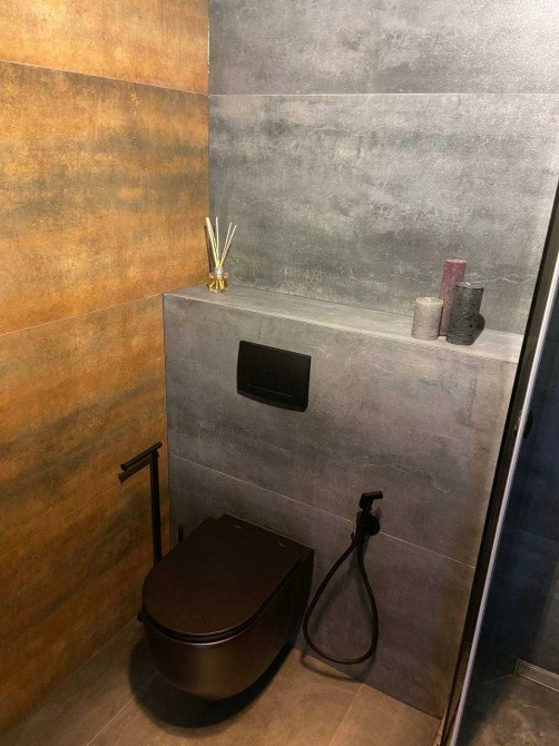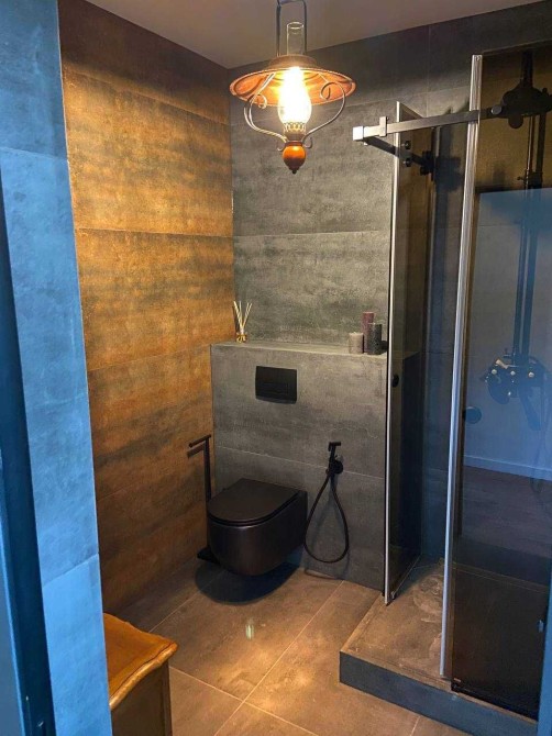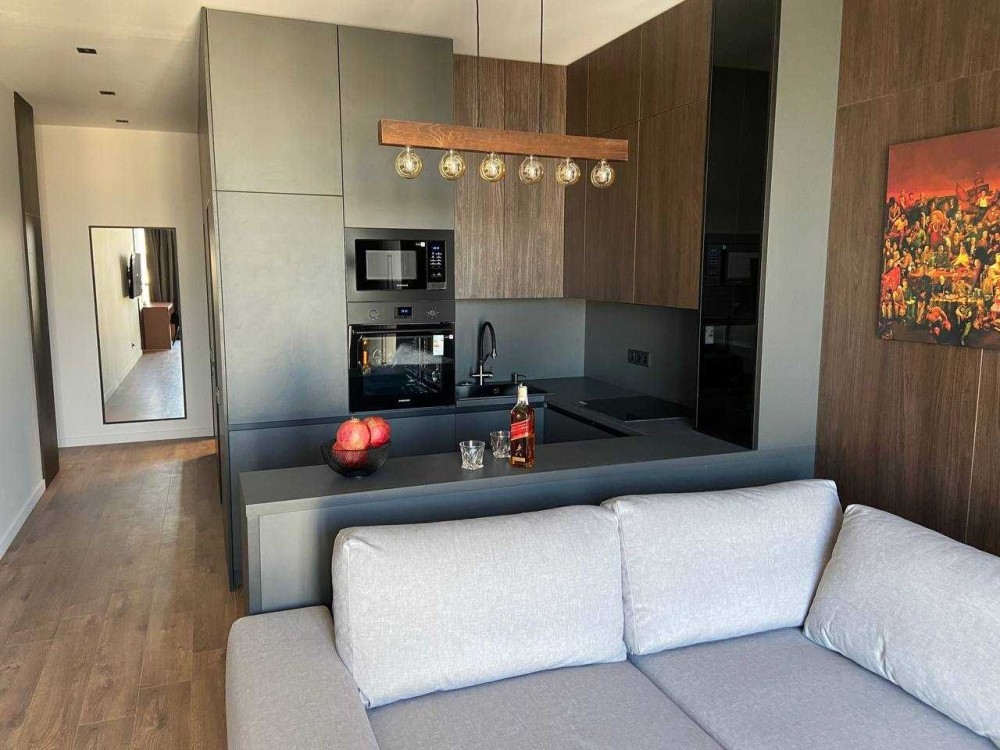 Дизайн интерьера выполнен в темных тонах из премиальных материалов ( дсп и мдф Egger, Niemann), качественная сантехника Hansgrohe, мебель из итальянских каталогов выполненная на заказ, винтажные реставрированные элементы мебели и освещения, техника Samsung.