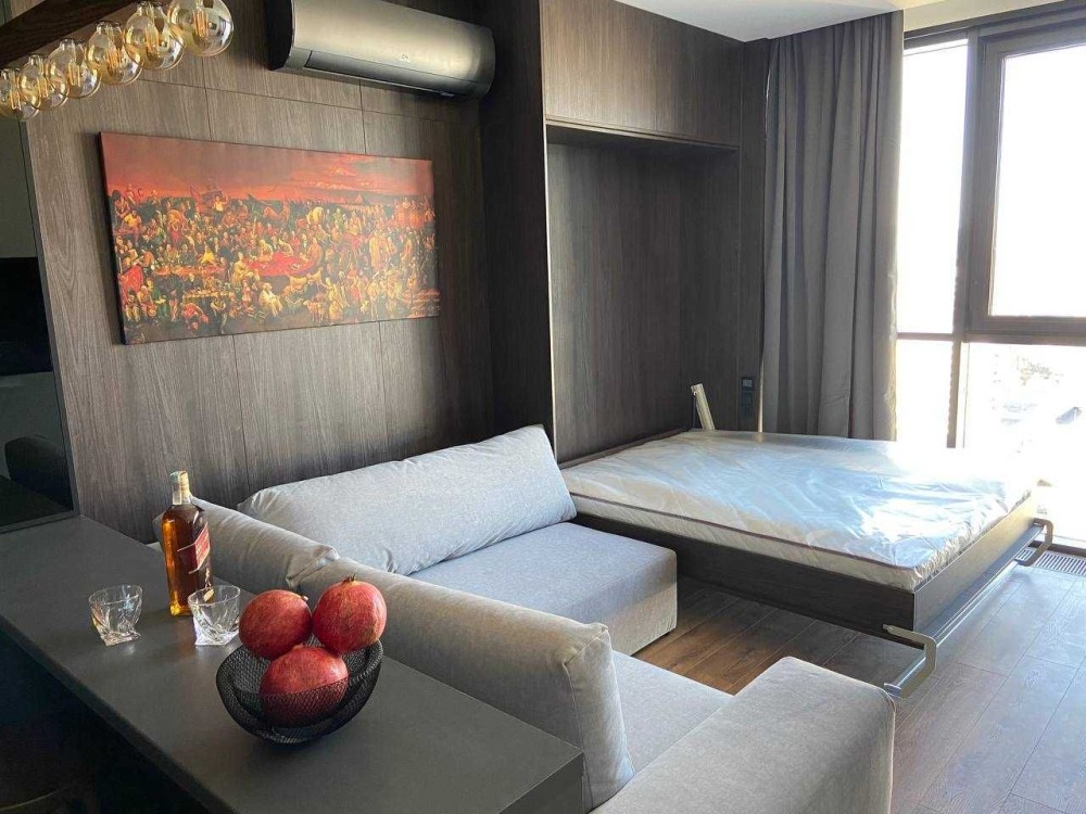 - изюминка – кровать-трансформер, что дает возможность увеличить пространство при приеме гостей в сложенном виде и одновременно полноценная двухспальная кровать с ортопедическим матрасом.