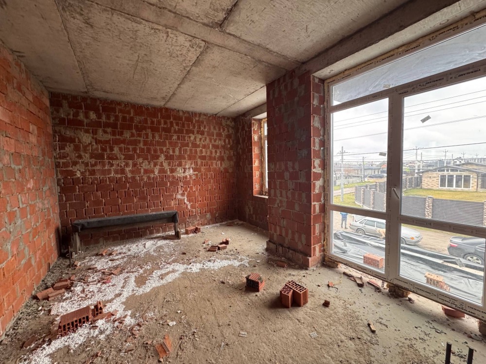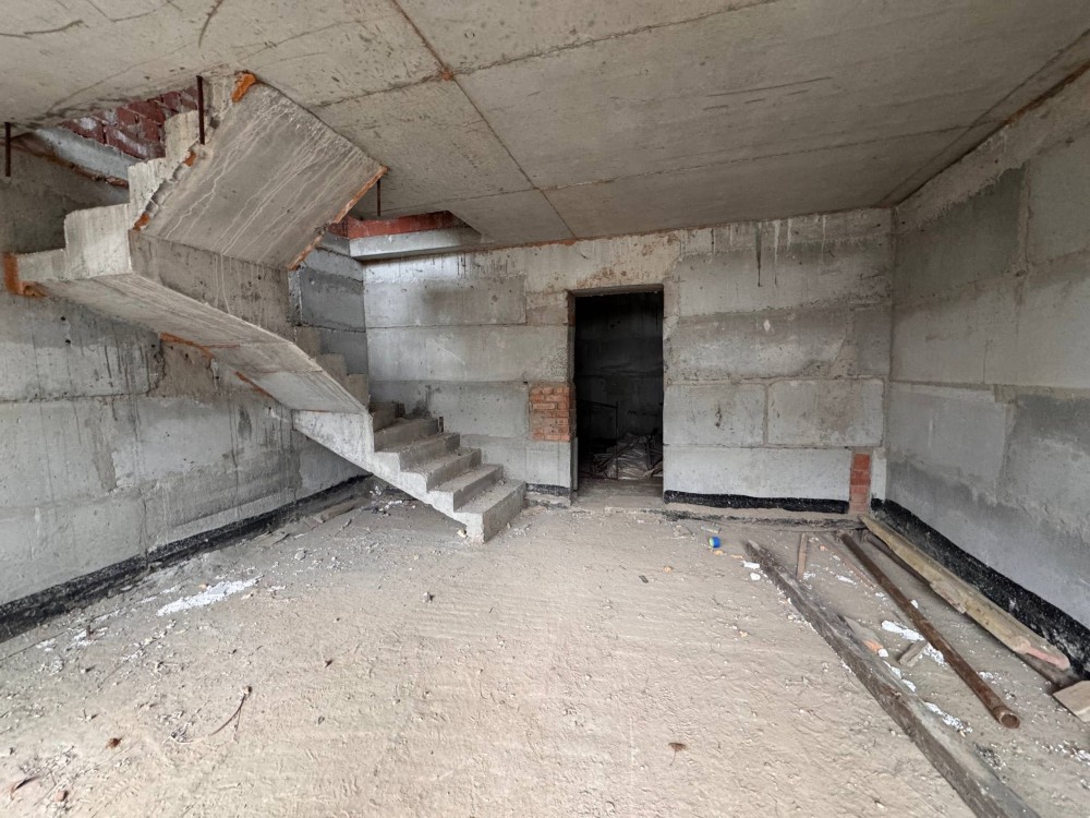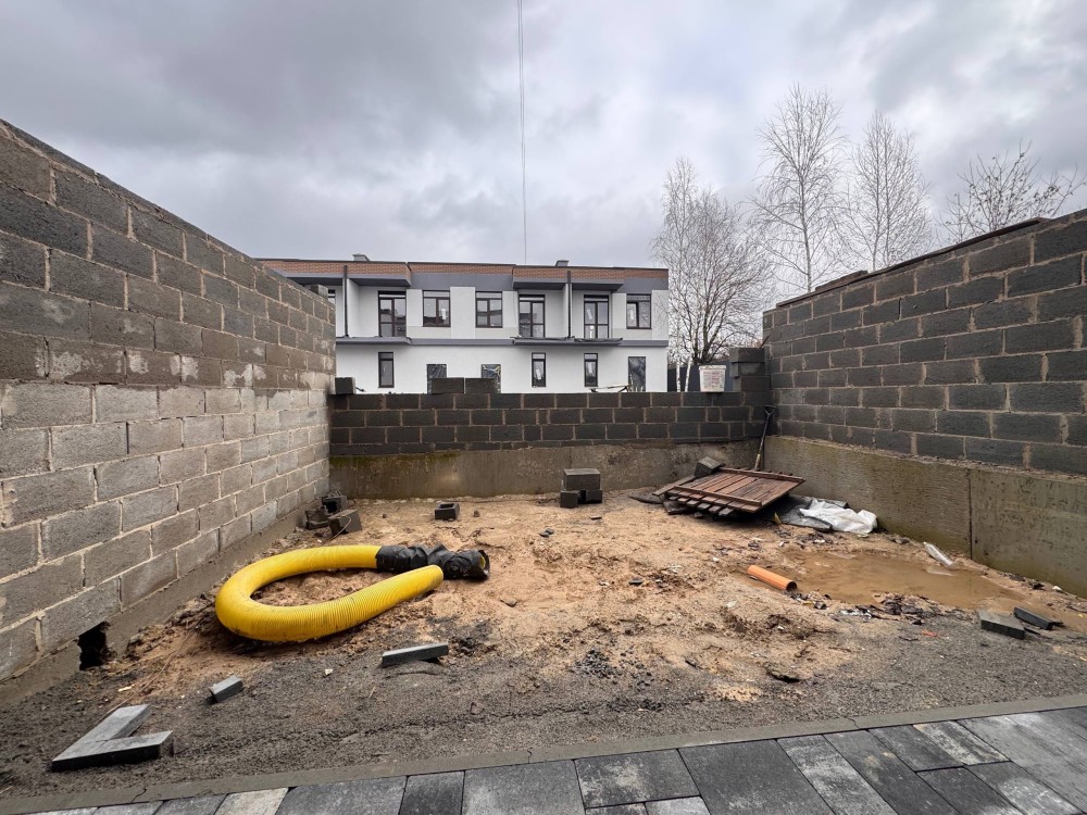 - Двоповерховий таунхаус з цокольним поверхом та своєю терасою. Перший рівень: передпокій, санвузол, побутова кімната, спальня. Другий поверх: дві кімнати та санвузол. Нульовий поверх з моноліту і чудово підходить для укриття: кухня-вітальня з виходом на терасу, технічне приміщення