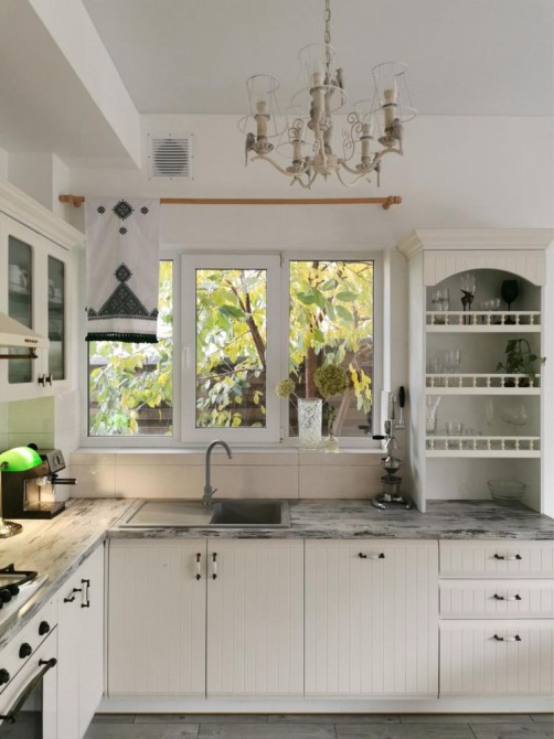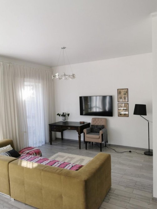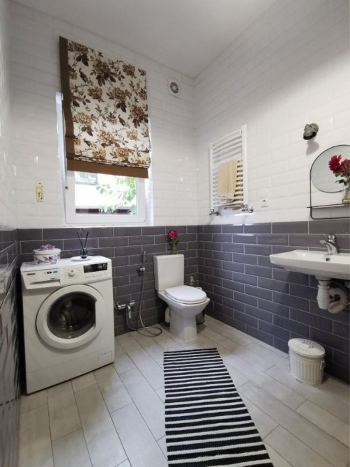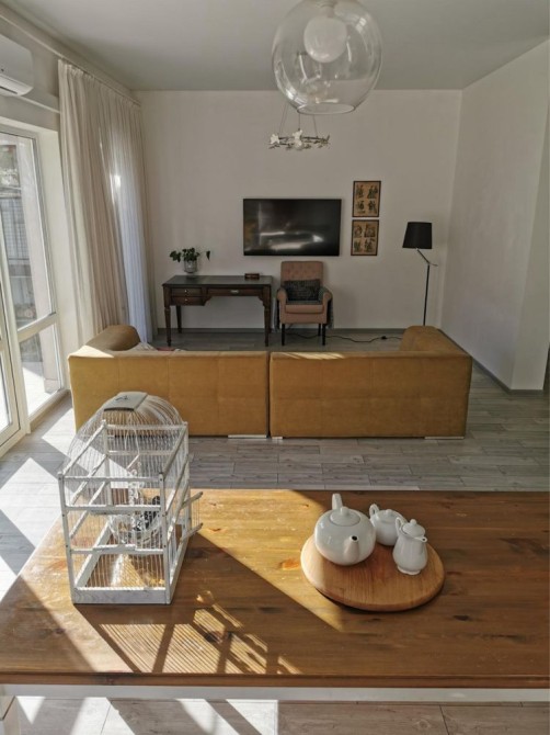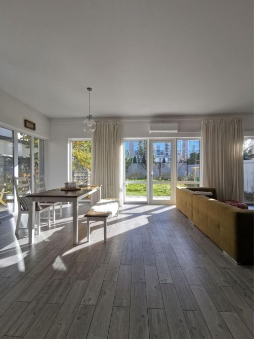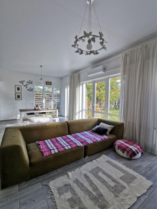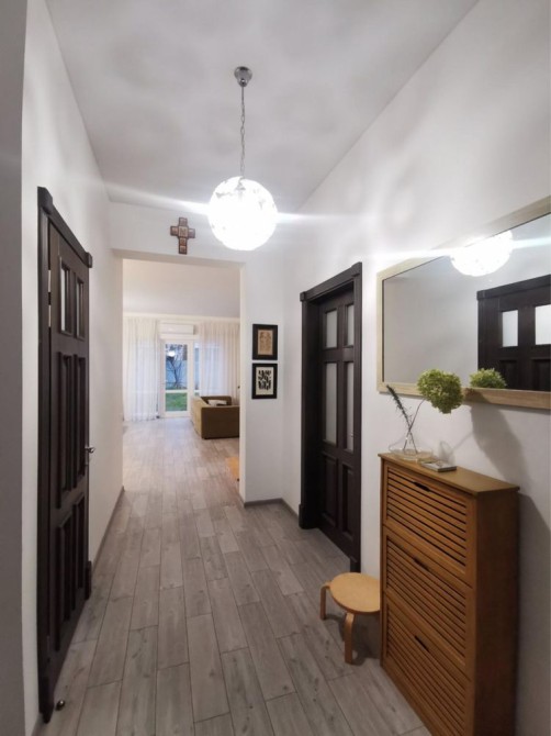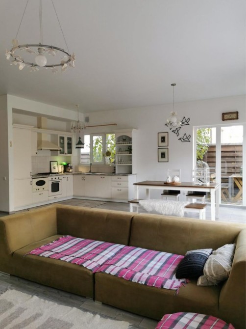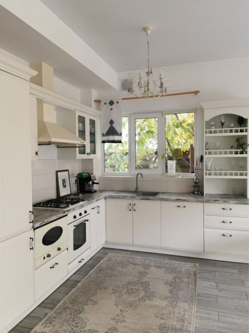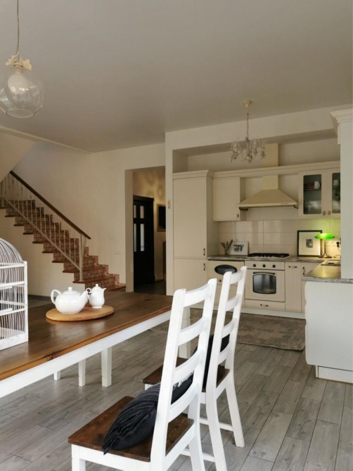Перший поверх: велика кухня-вітальня, кабінет, санвузол, котельня, кладова під сходами. Підлога з підігрівом, кондиціонер, вбудована техніка (холодильник, мікрохвильова піч, духова шафа, газова варильна поверхня у ретро стилі, посудомийна машина). У вітальні телевізор Smart TV 65 дюймів, пральна машина.