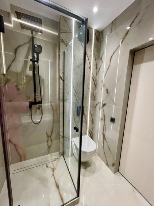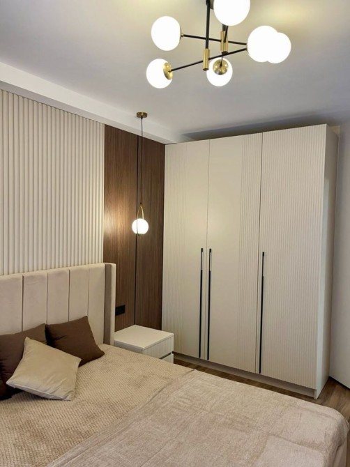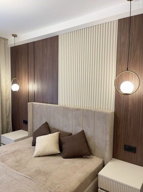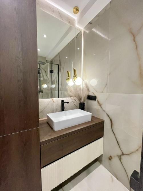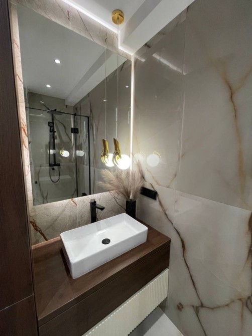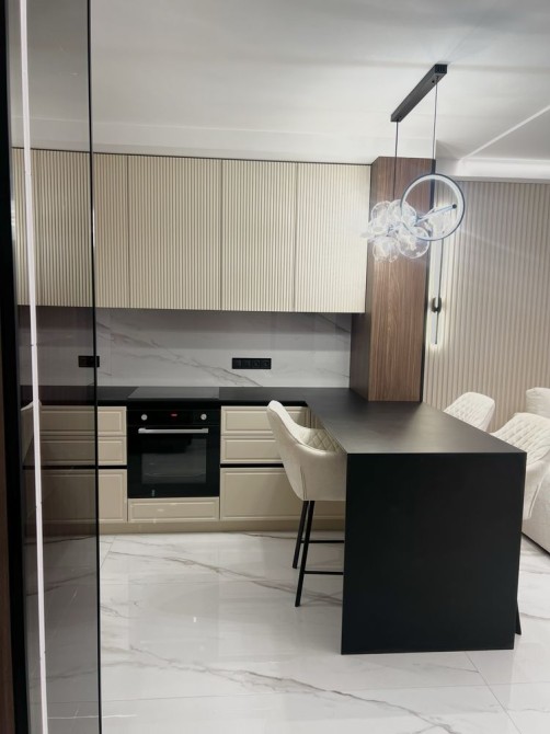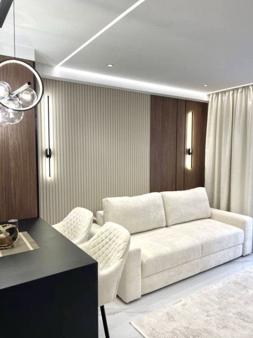 Квартира виконана у сучасному мінімалістичному стилі з використанням дорогих матеріалів, декоративного освітлення та натуральних текстур дерева.