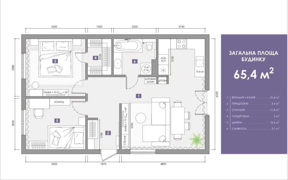 Площа будинку - 65,4 м²