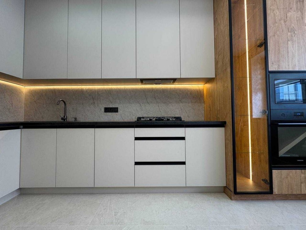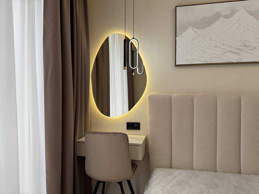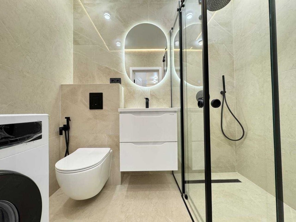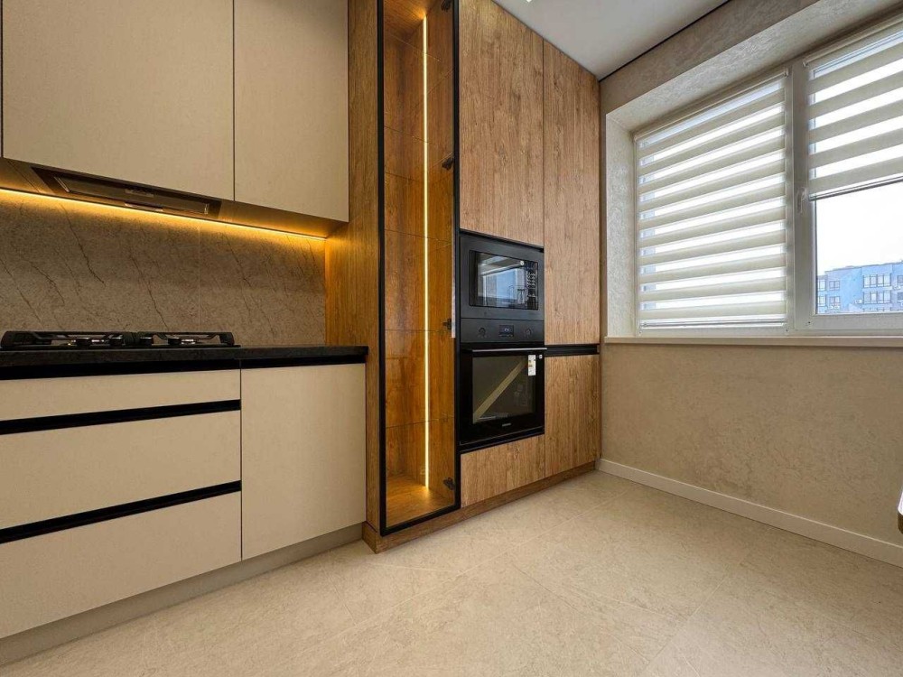 На кухні є обідній стіл з стільцями, робоча зона в якій вмонтований холодильник, духова піч, мікрохвильова, та витяжка. В спальній двоспальне ліжко з ортопедичним матрасом, приліжкові тумби та розпашна шафа. В санвузлі ванна з тропічним душом, інсталяція, дзеркало та рукомийник пральна машина. По квартирі встановлений підігрів підлоги.