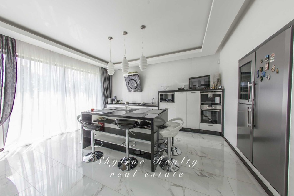 Сучасна італійська кухня з мармуровим столом, витяжкою Elica та холодильником Hebher;