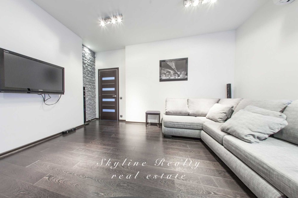 Простора вітальня з великими вікнами;