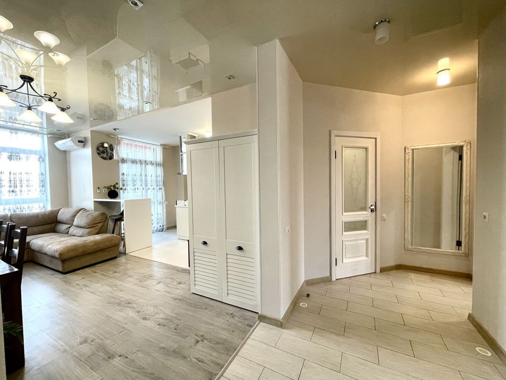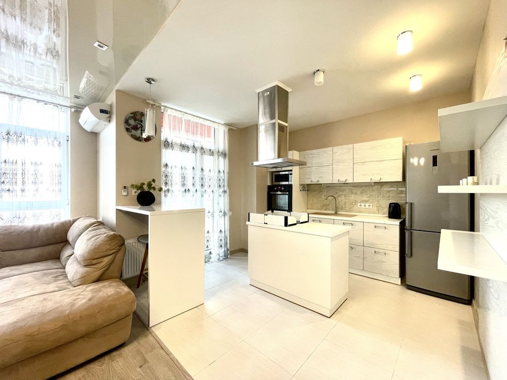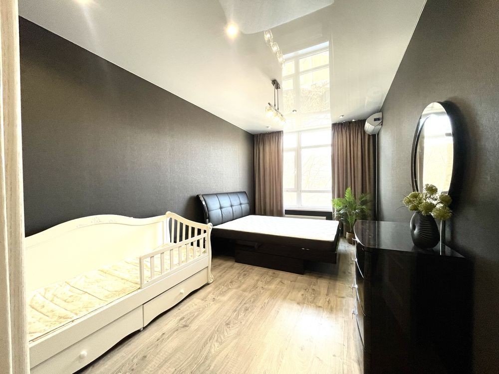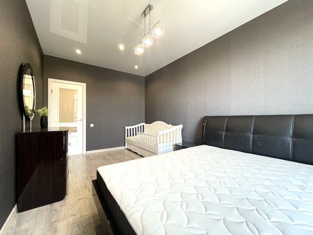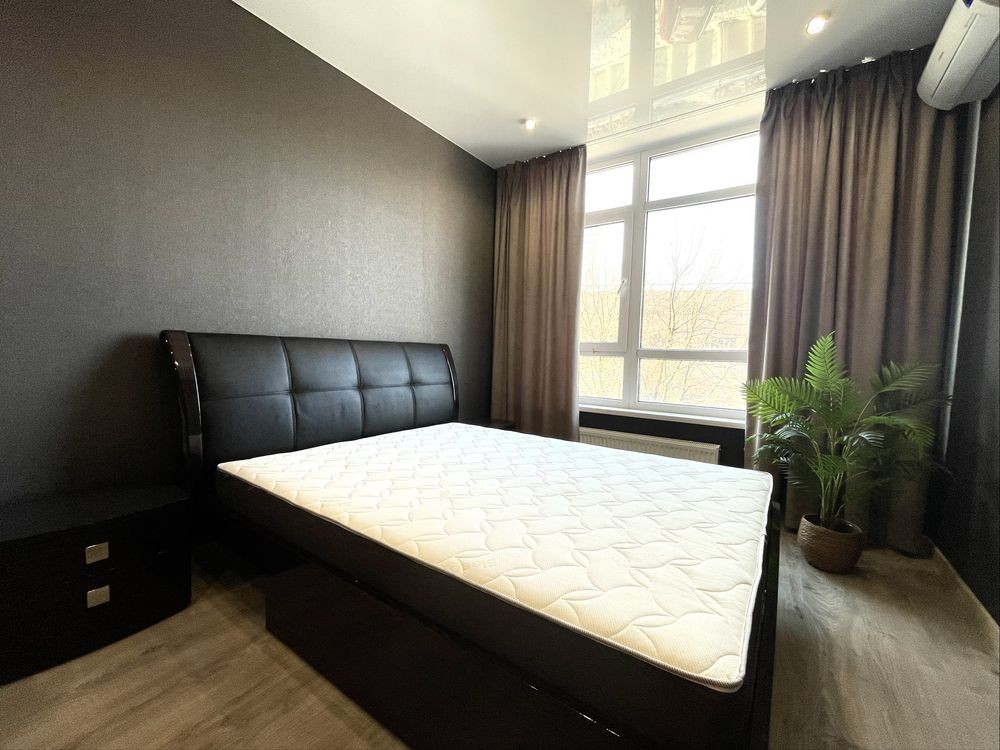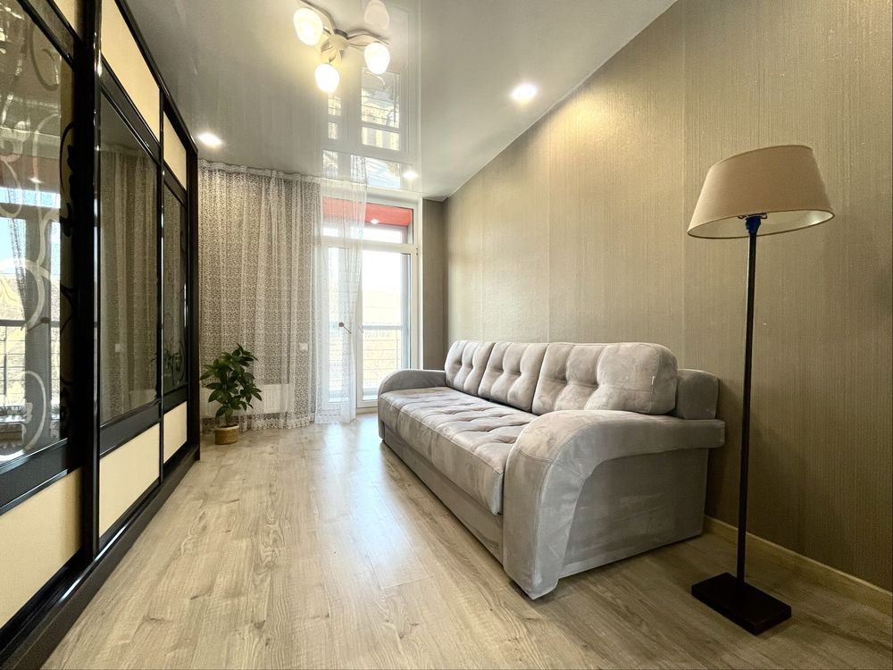 • Вбудована кухня, великі шафи-купе, ліжко з якісним матрацом та розкладний диван та інші меблі (все залишається), засклена лоджія на кухні та в кімнаті