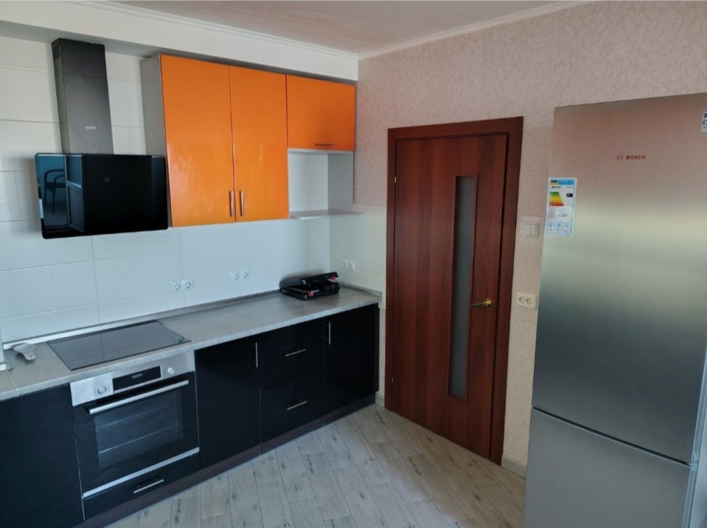 Стильна кухня: Яскравий сучасний гарнітур у соковитому помаранчевому кольорі. Кухня оснащена всією необхідною технікою: варильна панель, духова шафа, витяжка та холодильник. За потреби є можливість встановити посудомийну машину.