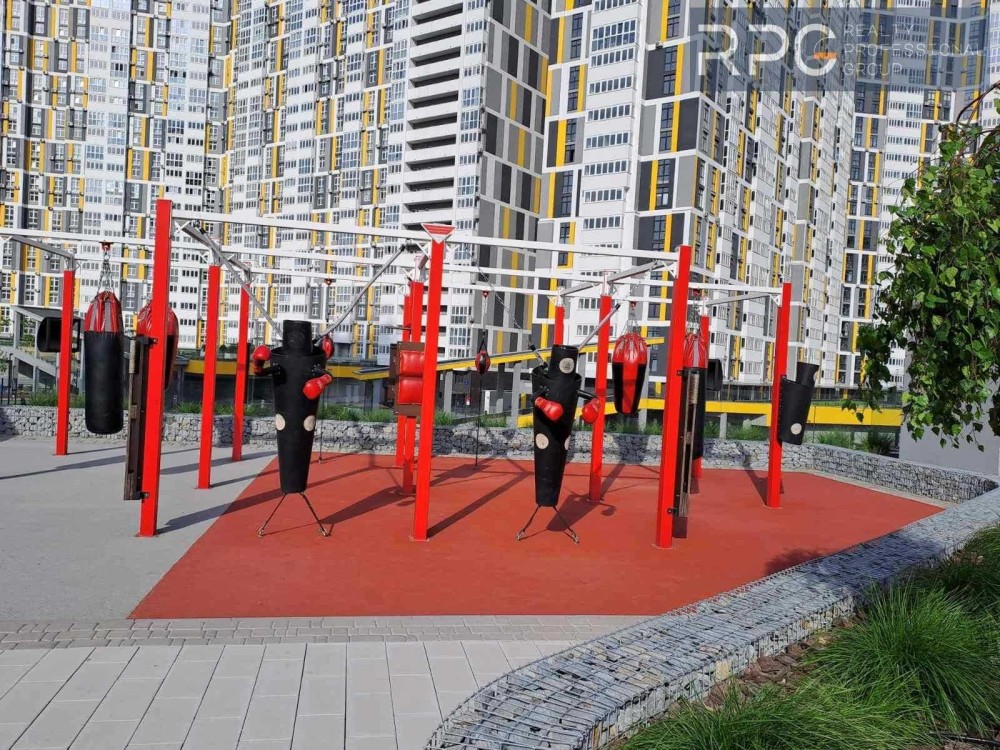 Спортивна зона з тренажерами просто неба, дитячі ігрові зони для дітей різного віку