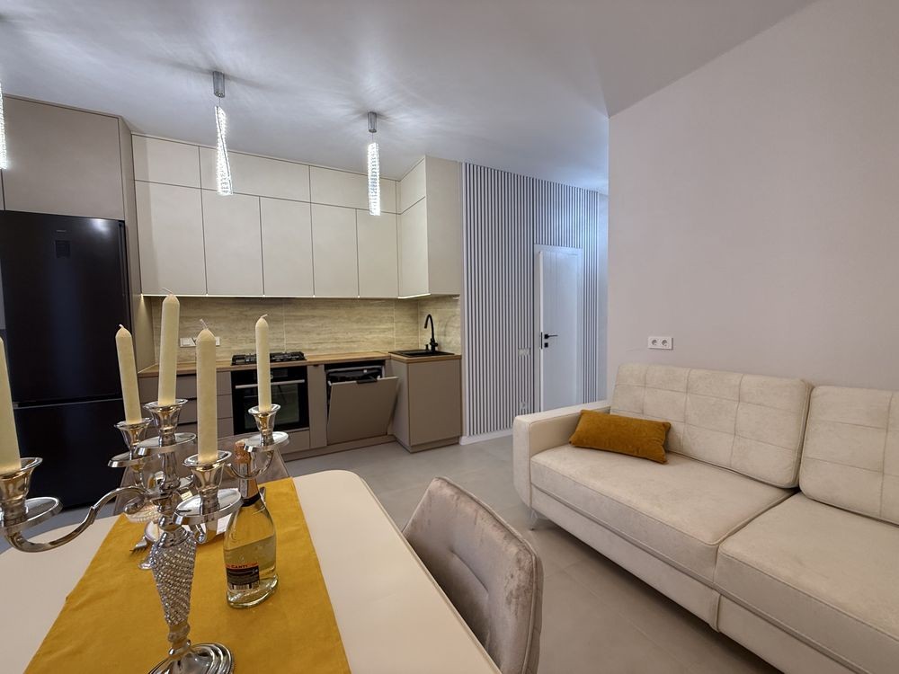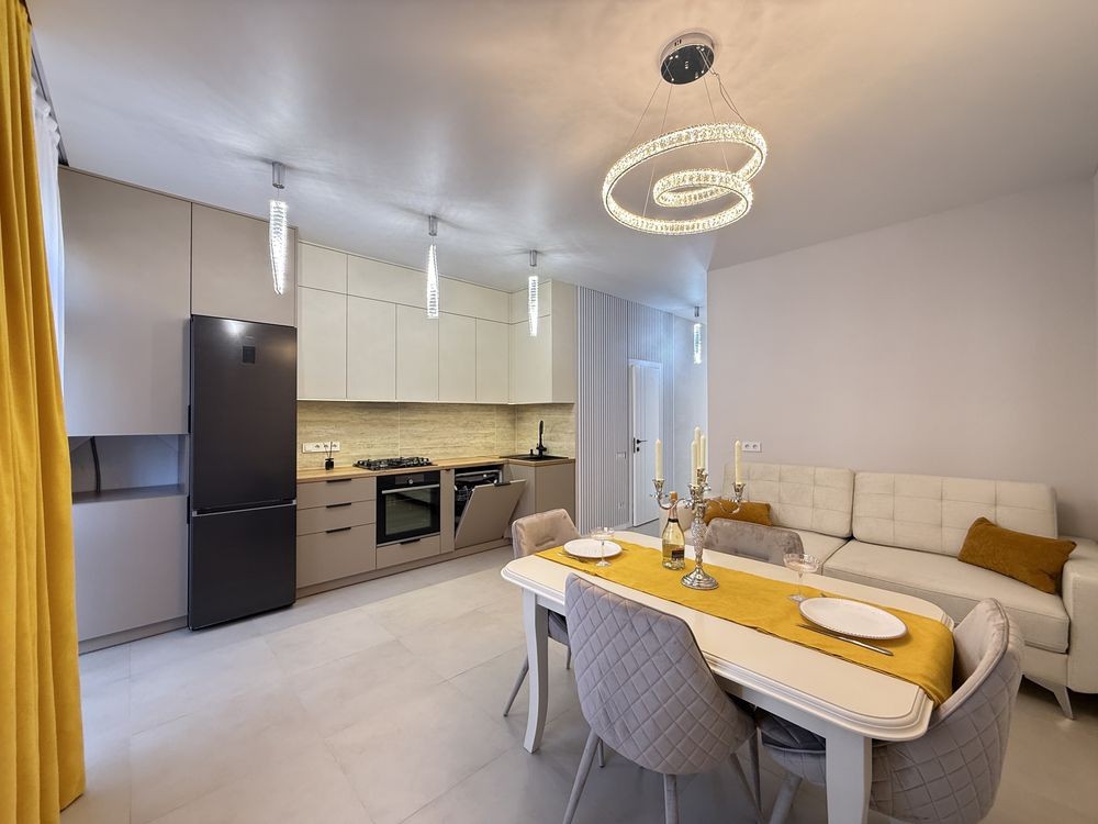 - кухня вітальня з вбудованими меблями та технікою