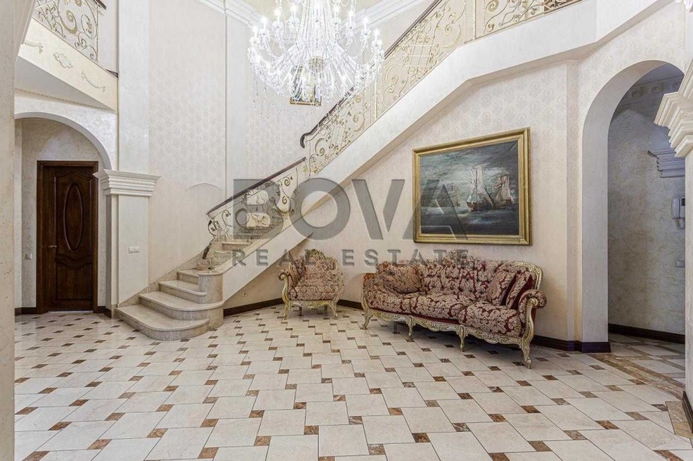 - просторий хол із круговими сходами, величезною люстрою по центру будинку;