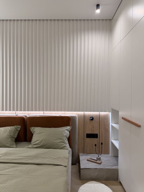 Планировка: кухня-гостиная, спальня с санузлом, гардеробная, гостевой занузел.