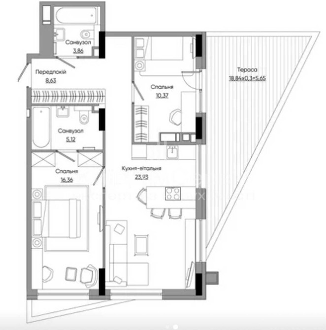 Квартира складається з двох окремих кімнат, просторої кухні-вітальні 24 м2, двох санвузлів та великої власної тераси 19 м2.