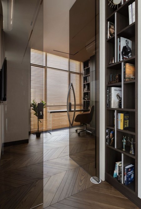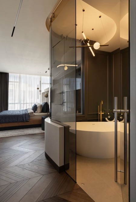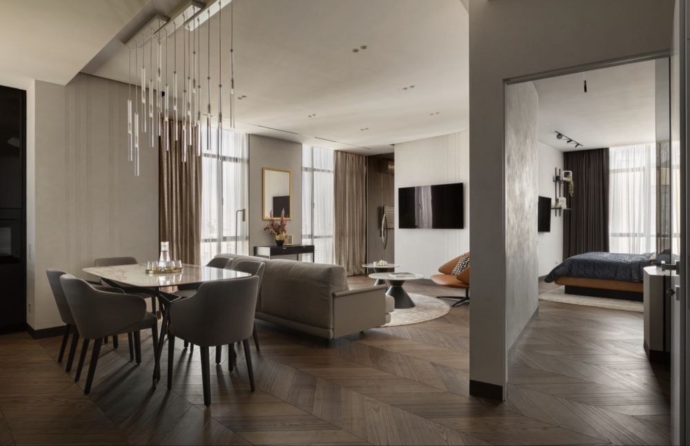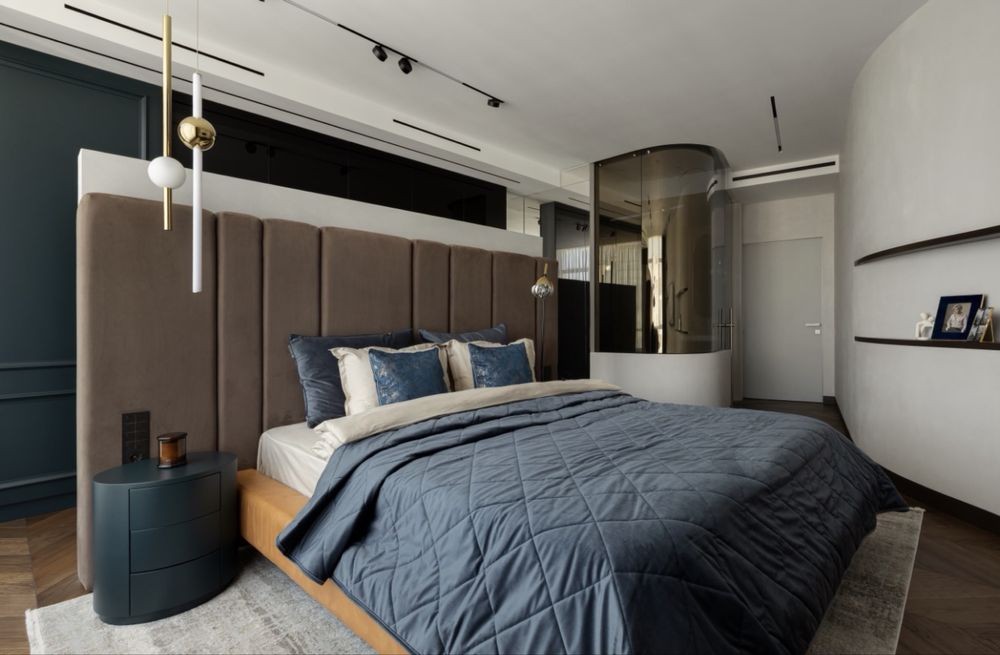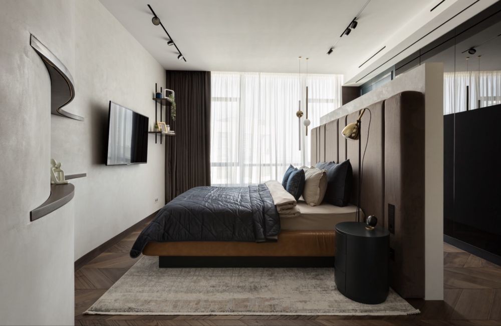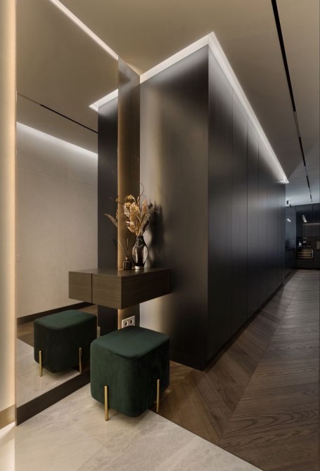 Планировка: спальня с санузлом и гардеробной, кухня-студия, гостевая спальня/кабинет, гостевой санузел, большой холл с хранением.