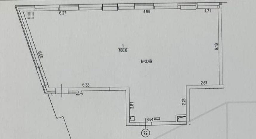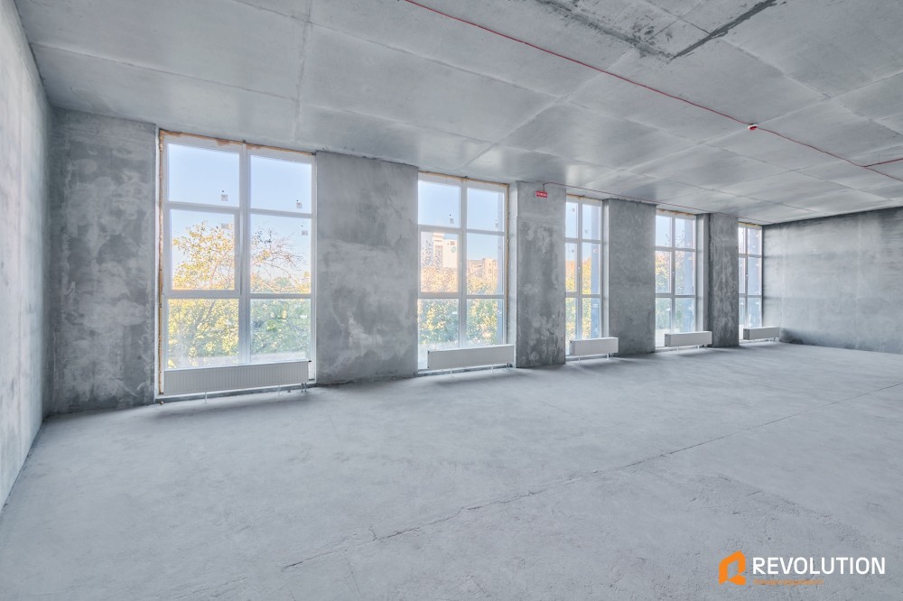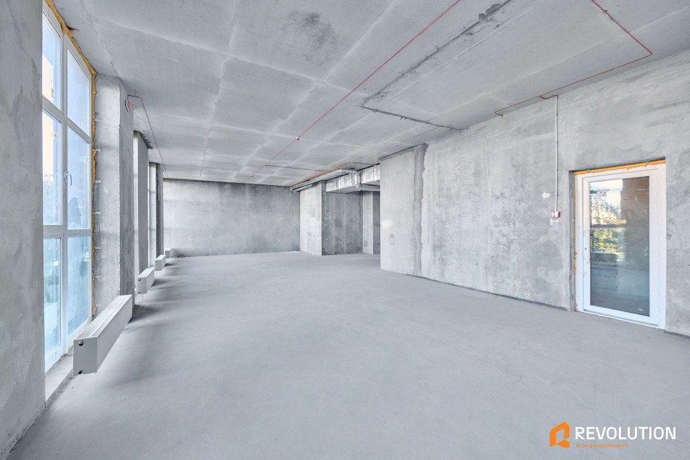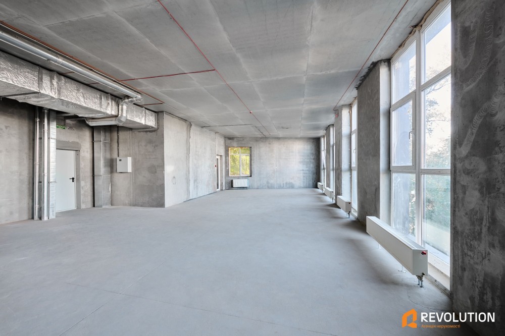 Формат та планування – 100 м² у прямокутній формі з високими стелями 3,45 м і панорамними вікнами. Простір легко адаптувати під будь-який бізнес