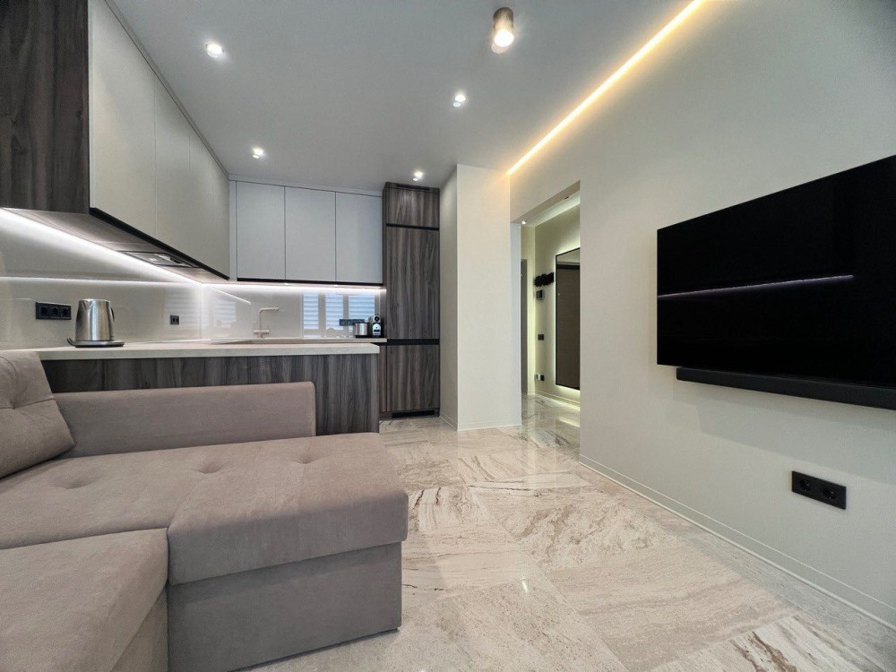 * Повна комплектація меблями під замовлення (вбудовані шафи, кухня, двоспальне ліжко з ортопедичним матрацом, розкладний диван, обідній стіл)